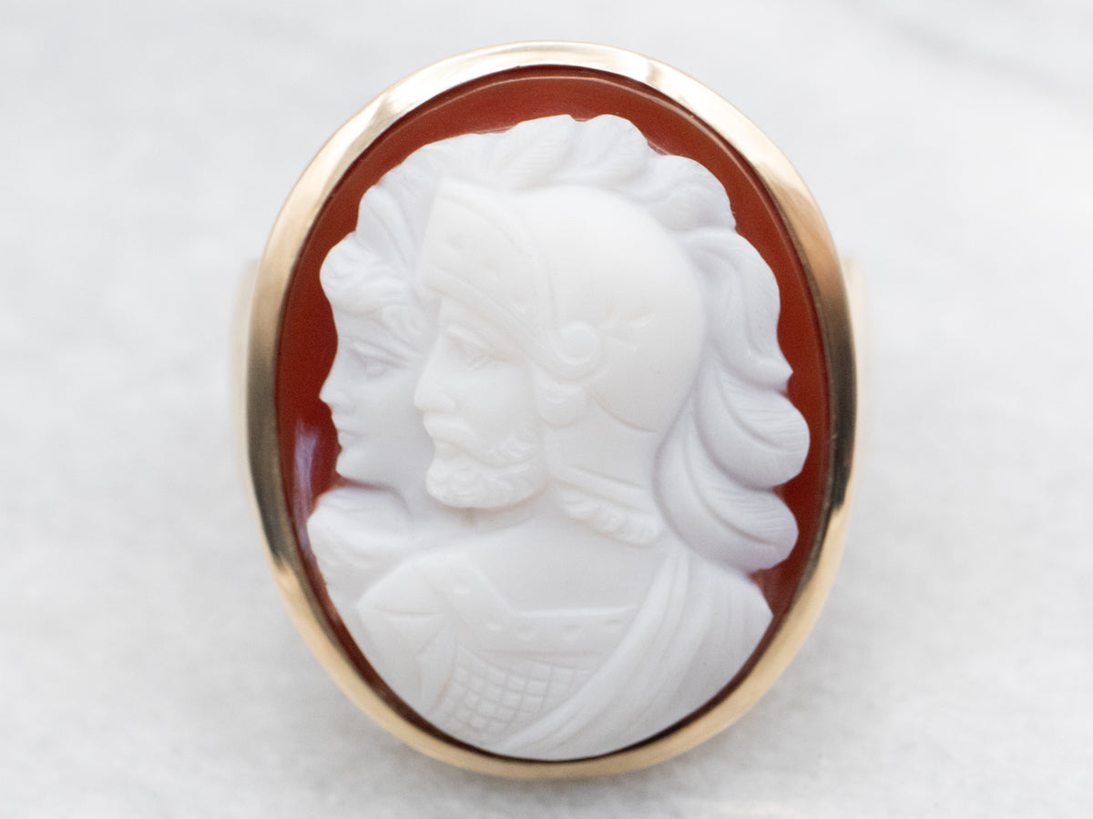 Crafted with stunning yellow gold, this cameo ring features a detailed cameo of two figures, a Roman Soldier alongside his loving wife. The intricate design and bold statement style make it a must-have for any jewelry collection. Elevate your look with a touch of ancient history and elegance!