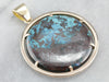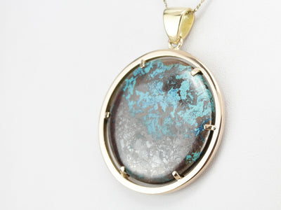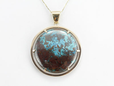 Wow! The bright blue-green and rich mocha colored veining of the chrysocolla gemstone is gorgeous, with plenty of variety in the coloration and a perfect polish. This pendant is a beautiful size, and could make a great statement on a short or long chain! The six bold prongs hold the stone simply and beautiful, and the simple gold frame is a perfect complement for this stone, this is a fantastic unisex piece!