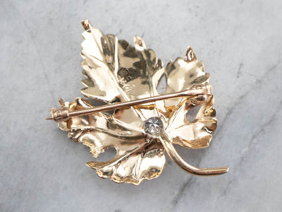 Absolutely outstanding! This vintage diamond grape leaf brooch is crafted of 14 karat gold, finished with gorgeous realistic texture. Grapes were a favorite symbol of the 1940s and 1950's, evoking the artistic, bohemian lifestyles of the Hollywood heyday and the sybaritic joys of the coast of France.