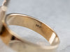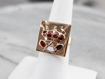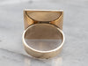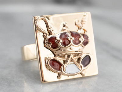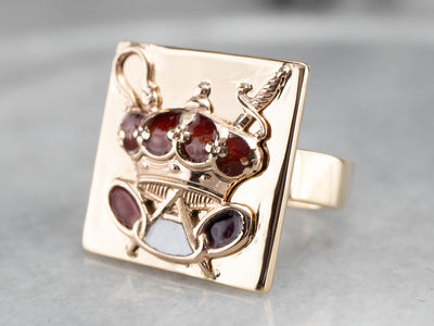 This polished yellow gold statement ring has structurally simple shoulders and a sleek rectangular shape. The center featured the Odd Fellow symbol, with a nice three-dimensional profile and wonderful enamel work!