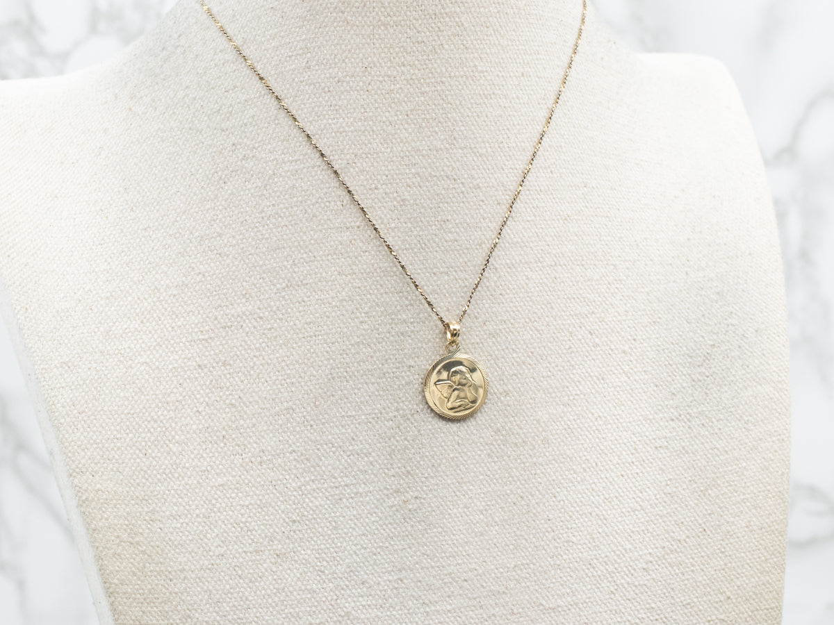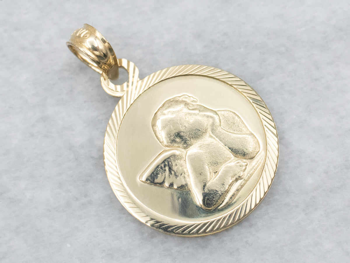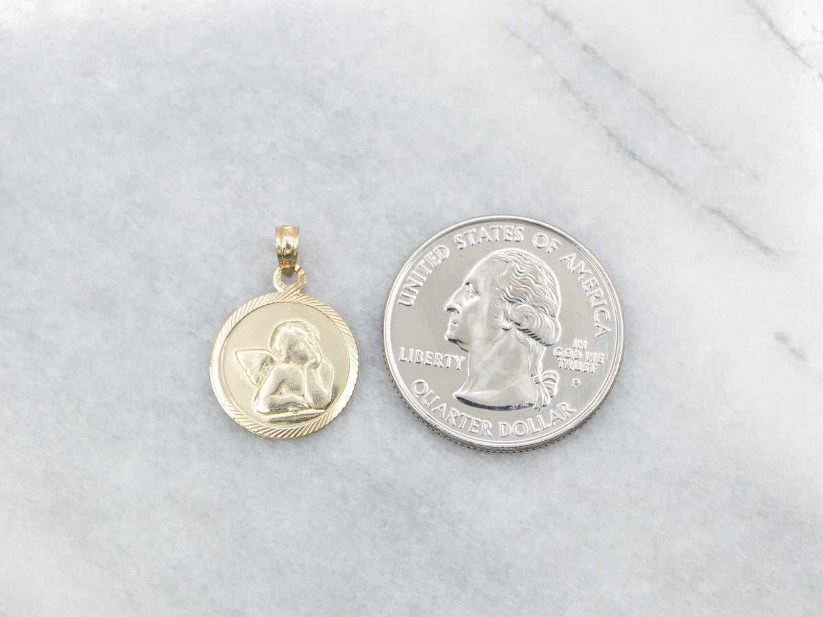So sweet! A contemplative cherub is depicted in this 14-karat gold medal, rendered in very fine detail. This piece could be worn as a pendant or added to a charm bracelet.