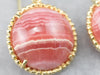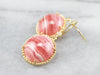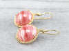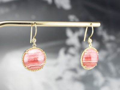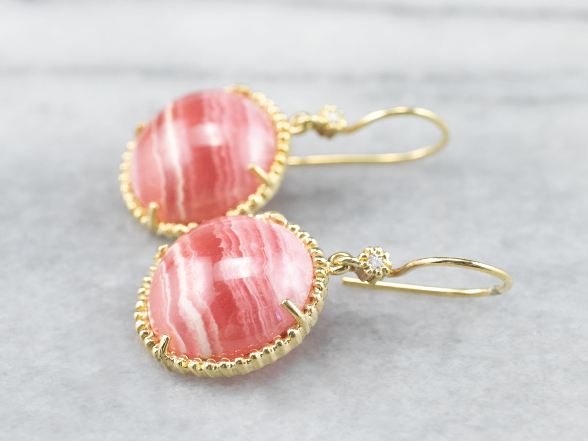 These vintage rhodochrosite and diamond drop earrings are in excellent condition, with simple textured polished gold frames. The length of these earrings makes them seem formal, however, the simplicity of the design works well for day or evening!