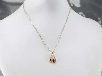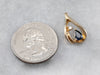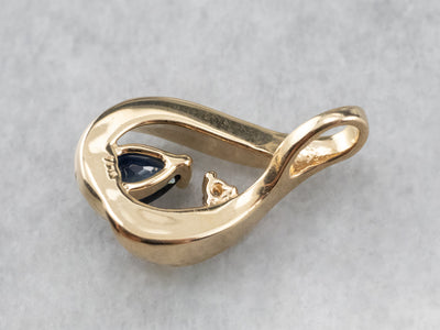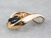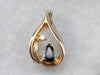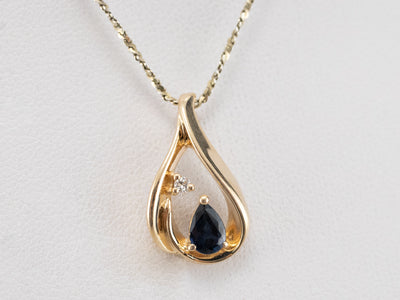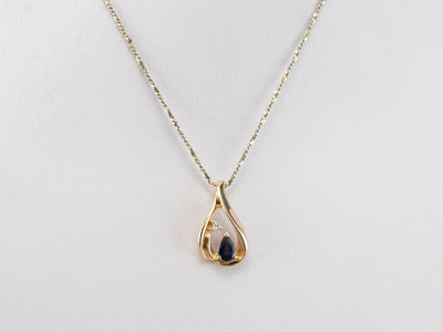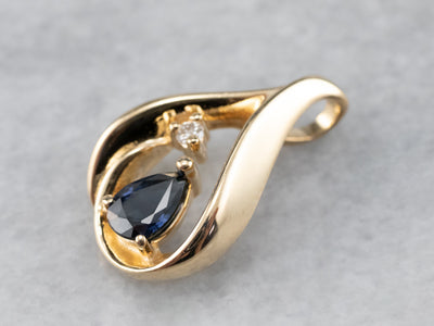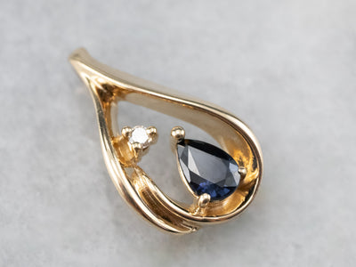 Deep, midnight blue, this pear-cut sapphire glistens with a velvety light! We love the ribbon style of the setting and the sweet glint of diamonds where gold meets stone!