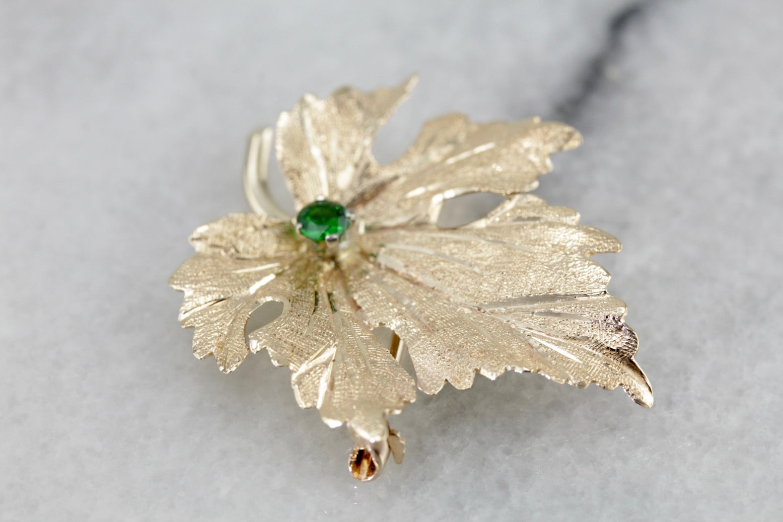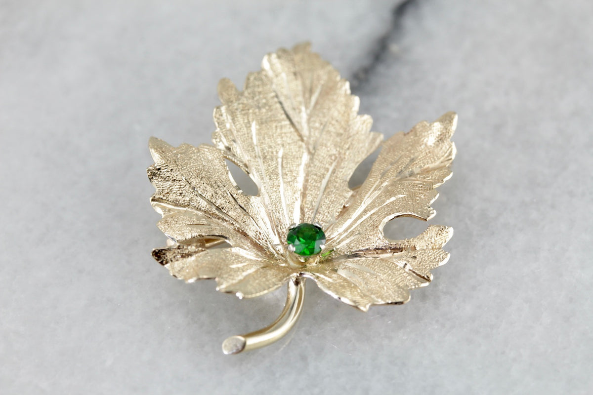 Absolutely outstanding! This vintage grape leaf brooch is crafted of 14 karat gold, finished with a gorgeous realistic texture. Grapes were a favorite symbol of the 1930's and 1940's, evoking the artistic, bohemian lifestyles of the Hollywood heyday and the sybaritic joys of the coast of France.