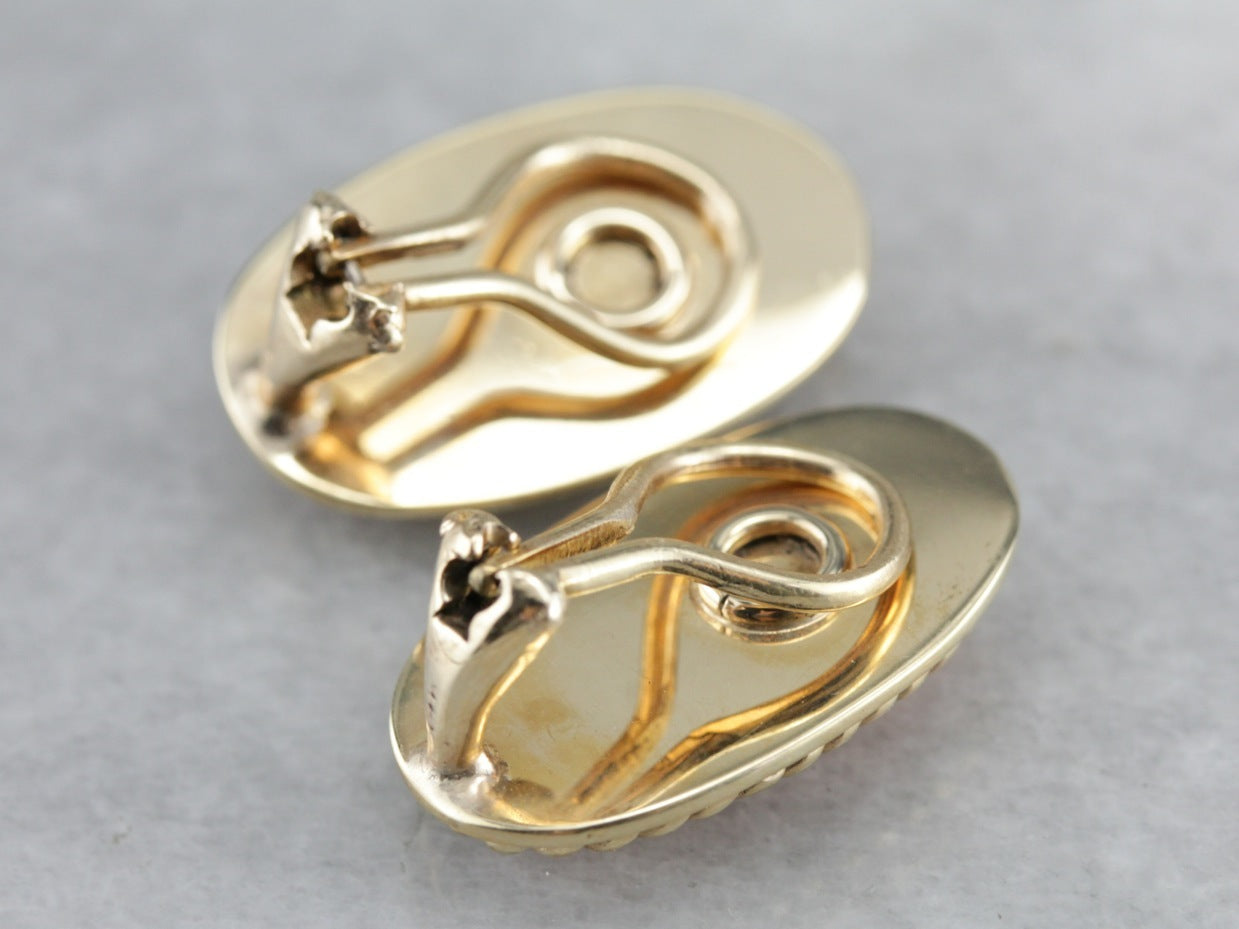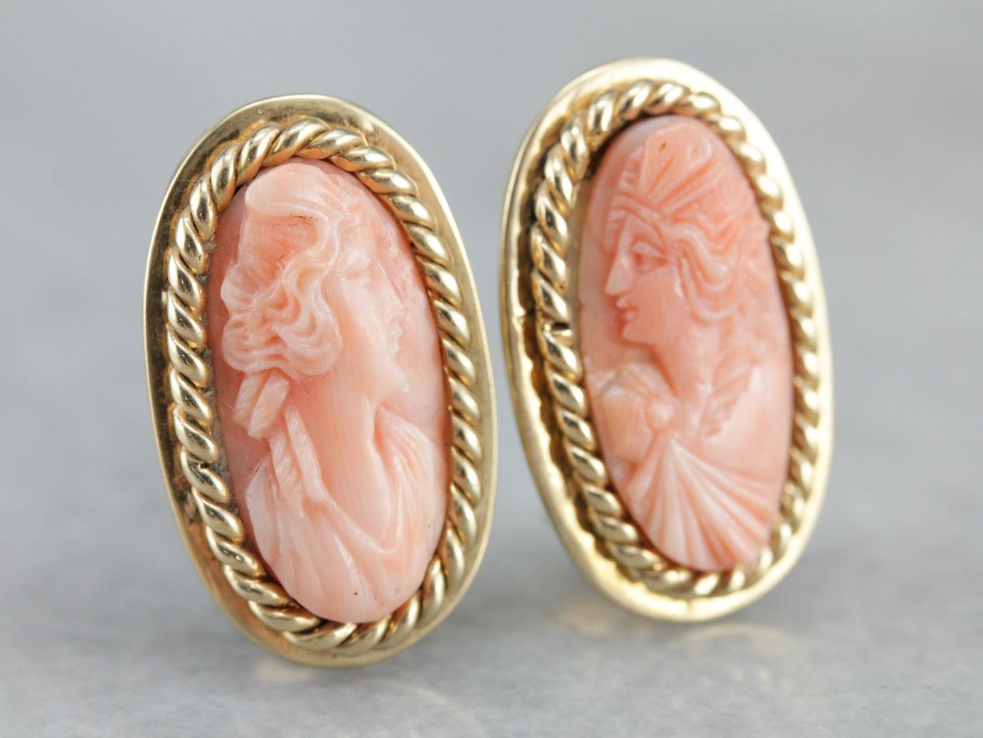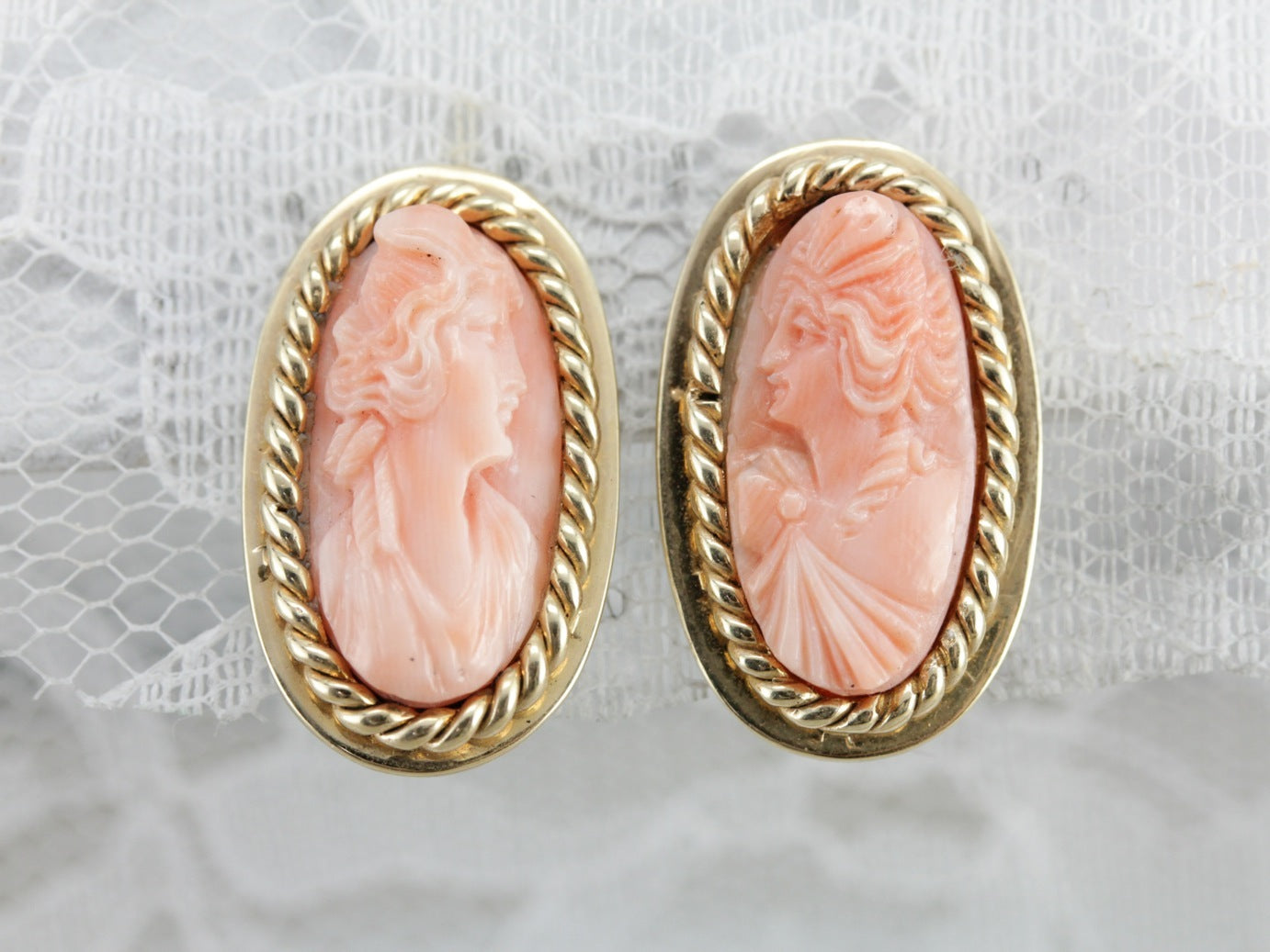 In these lovely earrings, perfect shell pink coral has been carved with artistry and talent to depict the portrait of a pair of Roman ladies. The color of the coral and the classical style of the carving tells us that these gems were quite possibly carved in Italy, the source of some of the finest cameo work in the world. The settings are modern, Mid Century pieces in yellow gold that feature a comfortable and secure clip mechanism.