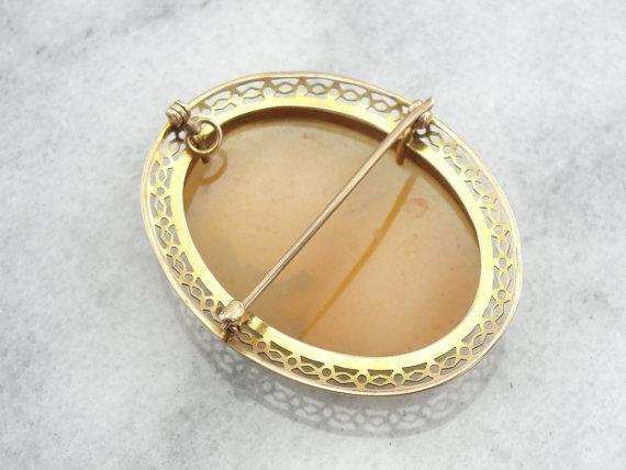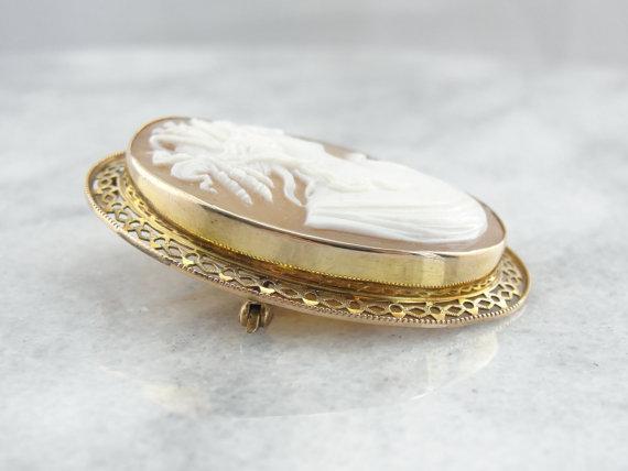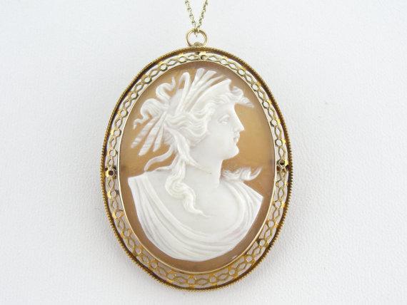 This cameo features a beautiful ancient matron wearing an intricate headdress that is reminiscent of a goddess of ancient Rome. This piece can be worn as a brooch or a pendant.