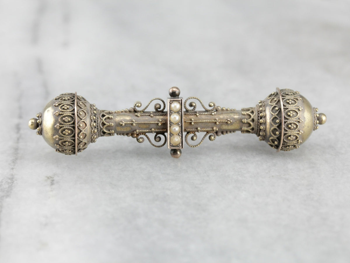 Beautifully crafted, this classic Victorian bar pin has some extra details! Made of 10k yellow gold with a slight rose hue, this late 1800s pin features ornate, gothic milgrain details and is accented with seed pearls. The locking clasp is a tube style, secure and original to the era.