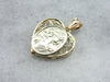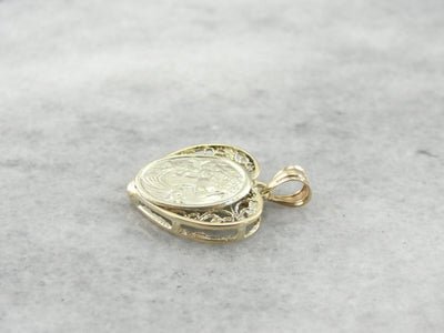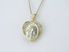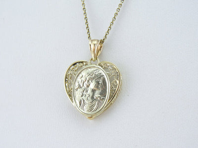 This pendant featuring the profile of a Greek woman, has a beautiful relief to her. Lying above the backdrop of a filigree heart, she appears as if a cameo. This dynamic pendant is crafted of 14 karat yellow gold and has been recreated by MSJ.