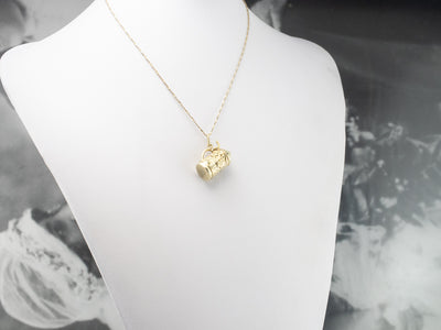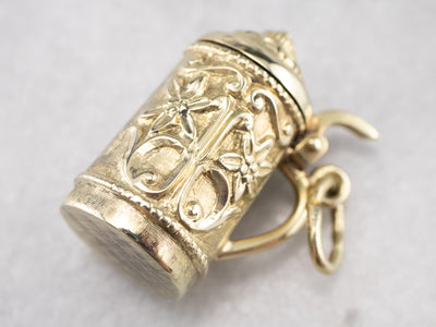 This beer stein charm is full of wonderful detail, crafted in 14 karat green gold. Ornately patterned with floral motifs, this charm even has a hinged lid that can be opened and closed!