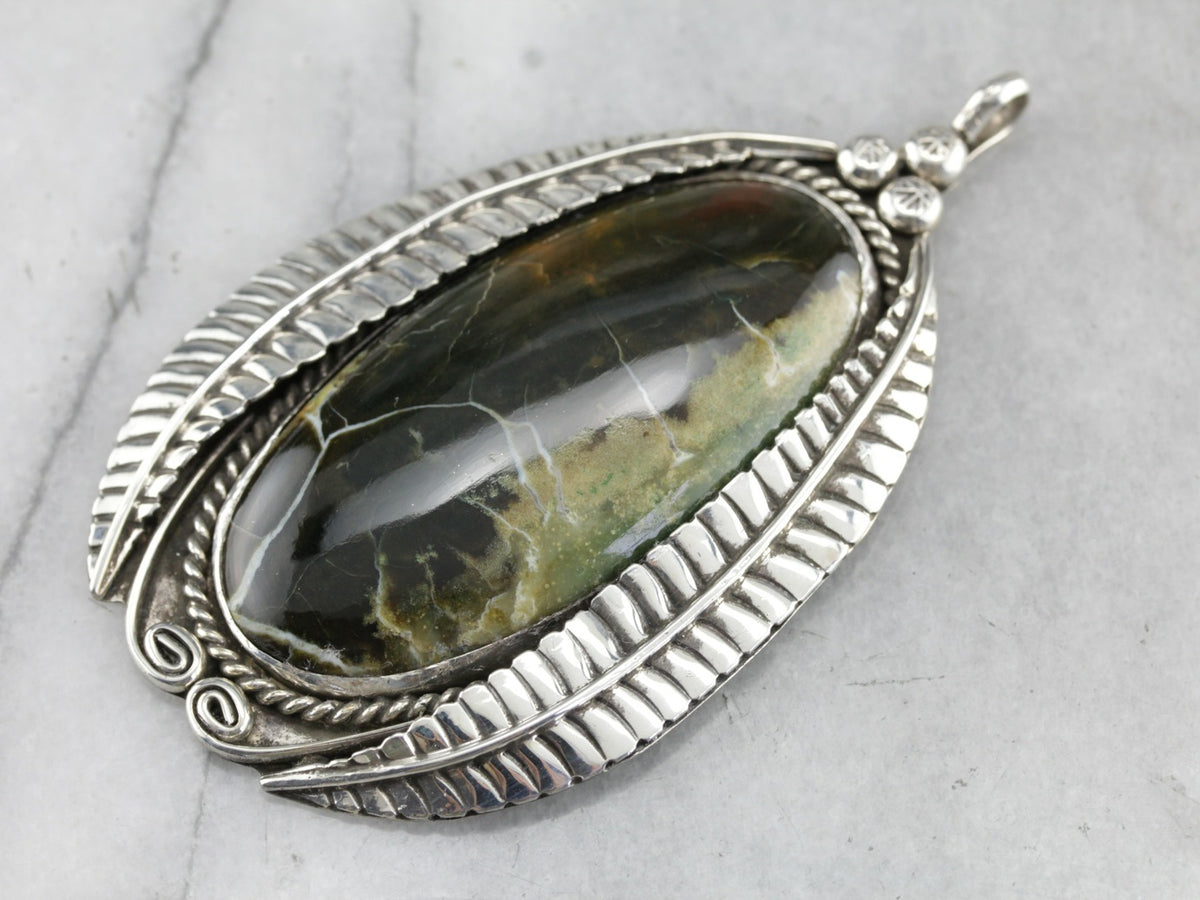 A green jasper cabochon in earthy hues of moss green, cream, and burnt umber sits at the center of this gorgeous sterling silver pendant, large in size this pendant is all about the stone, sure to be a conversation starter, this pendant is ready to wear or give as a gift!