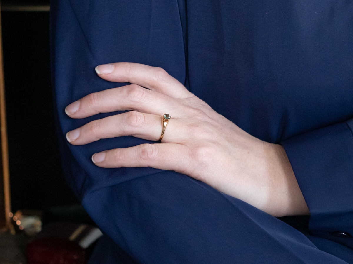 This exquisite ring is the perfect addition to any jewelry collection. An antique solitaire setting, crafted of 14-karat yellow gold which we set a beautiful green sapphire in its center, this lovely solitaire ring makes a timeless statement!