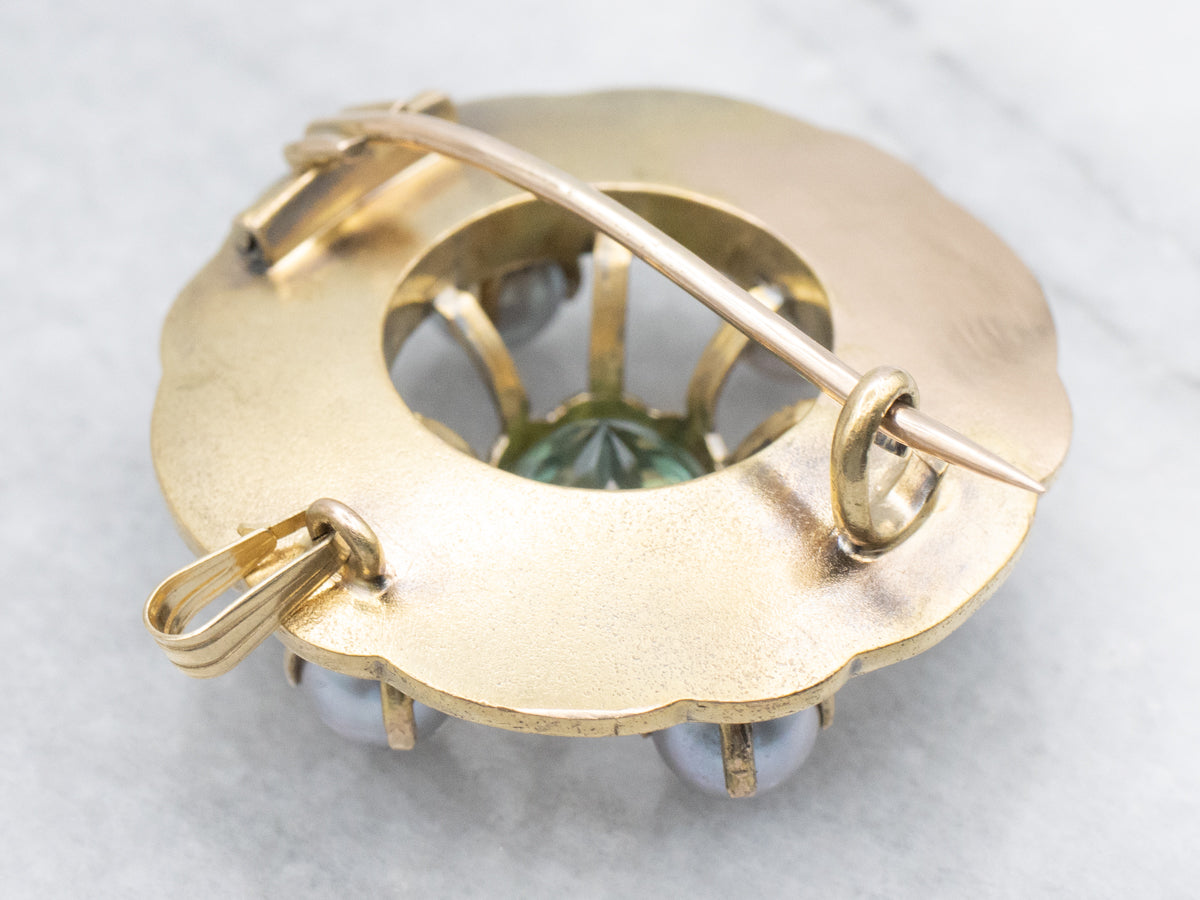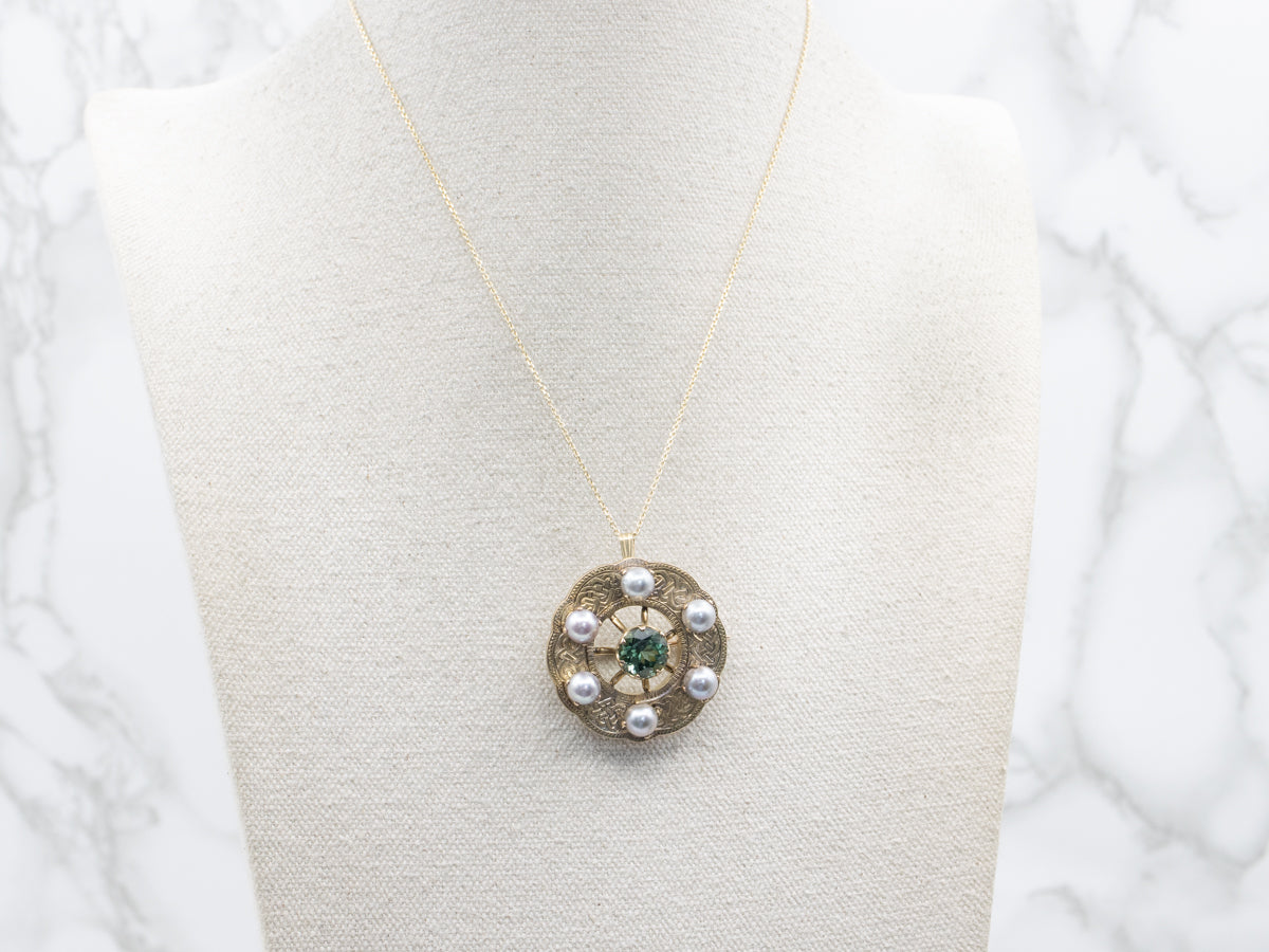 This exquisite antique piece features a beautifully etched Celtic knot design, symbolizing eternity and interconnectedness. Crafted as both a brooch and a pendant, it offers versatile wear to suit any occasion. The new green tourmaline and soft gray pearl have been carefully reset to enhance their natural beauty, creating a timeless accessory that honors tradition while adding a touch of elegance to your collection. Perfect for those who appreciate meaningful craftsmanship and classic style.