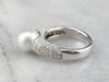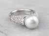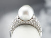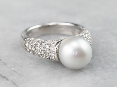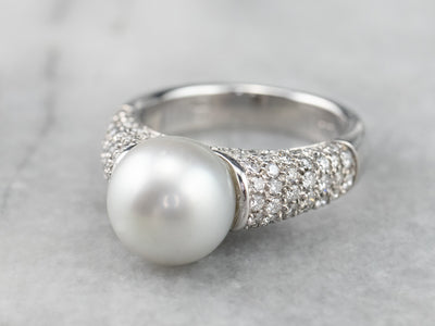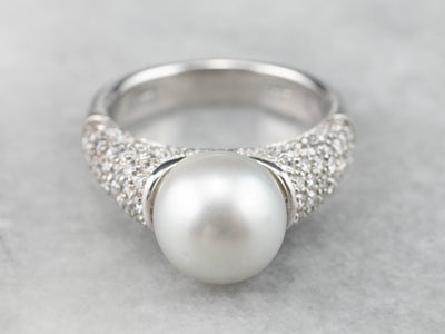 This pearl and diamond ring is the best of modern luxury! The pearl is a shimmering dove grey, with a sophisticated hue that plays off the crisp polish of the 18 karat white gold. Diamond encrusted shoulders heighten the glamour of this eye-catching ring!