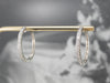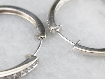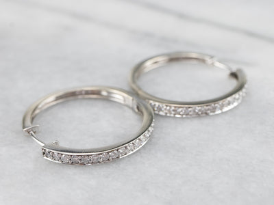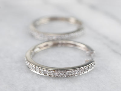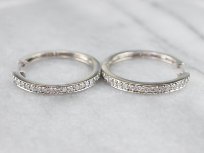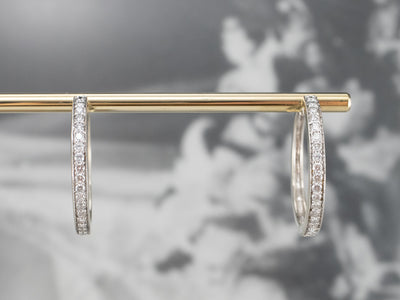 Crafted of polished 14 karat white gold, these wardrobe staples are hinged in the center, with locking posts that make them comfortable and secure on the ear! Sparkling high-quality diamonds in the front bring sparkle and shine to the hoops!