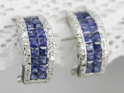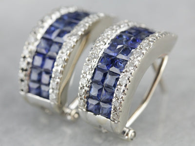 These high karat white gold earrings are classics, easy to transition from day to evening wear. The sapphires have a great deal of sparkle, accented by the bright diamonds to create a sophisticated statement! Secure hinged posts clasp firmly, for comfortable wear, hanging just below the ear.