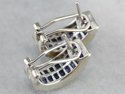 Metal: 18K White Gold Gem: 36 Sapphires totaling 3.06 Carats Gem Measurements: 2.3 mm, Square Accents: 44 Diamonds totaling .77 Carats, H in Color, I1 in Clarity Earrings Length: 19 mm Earrings Width: 9 mm Marks: "TT 18K" Stamped on the Findings