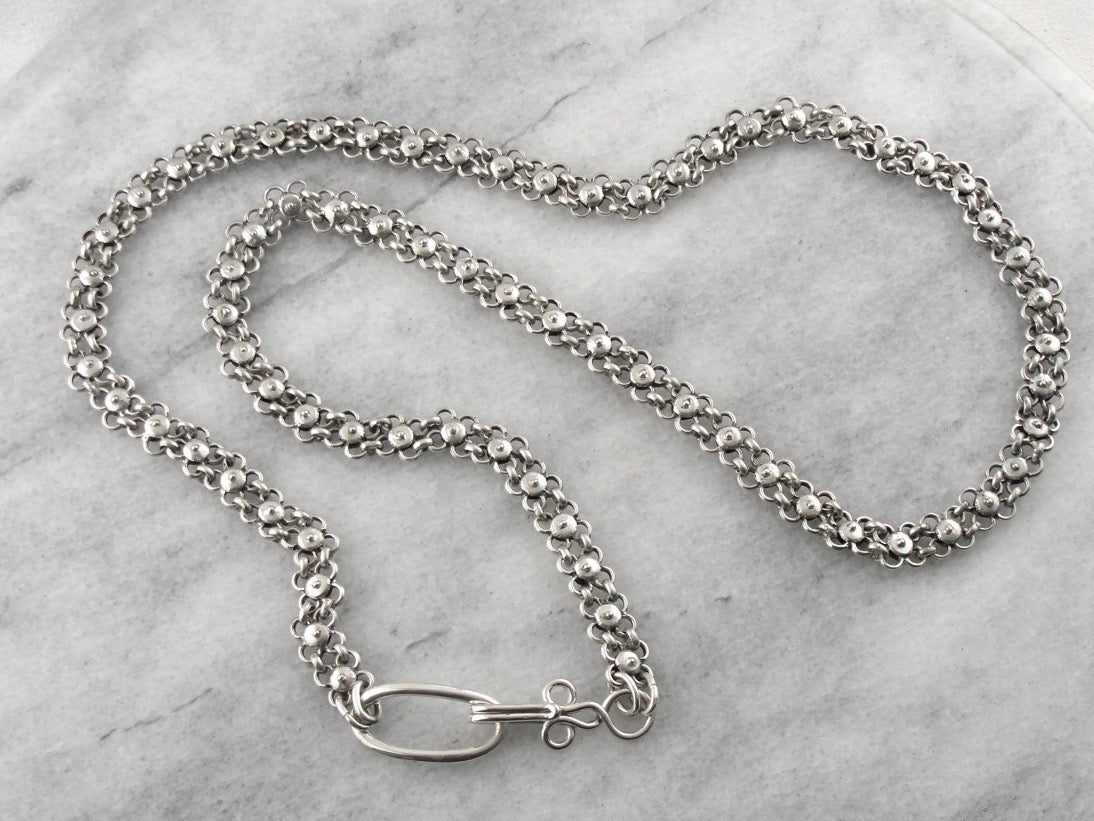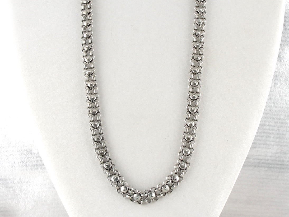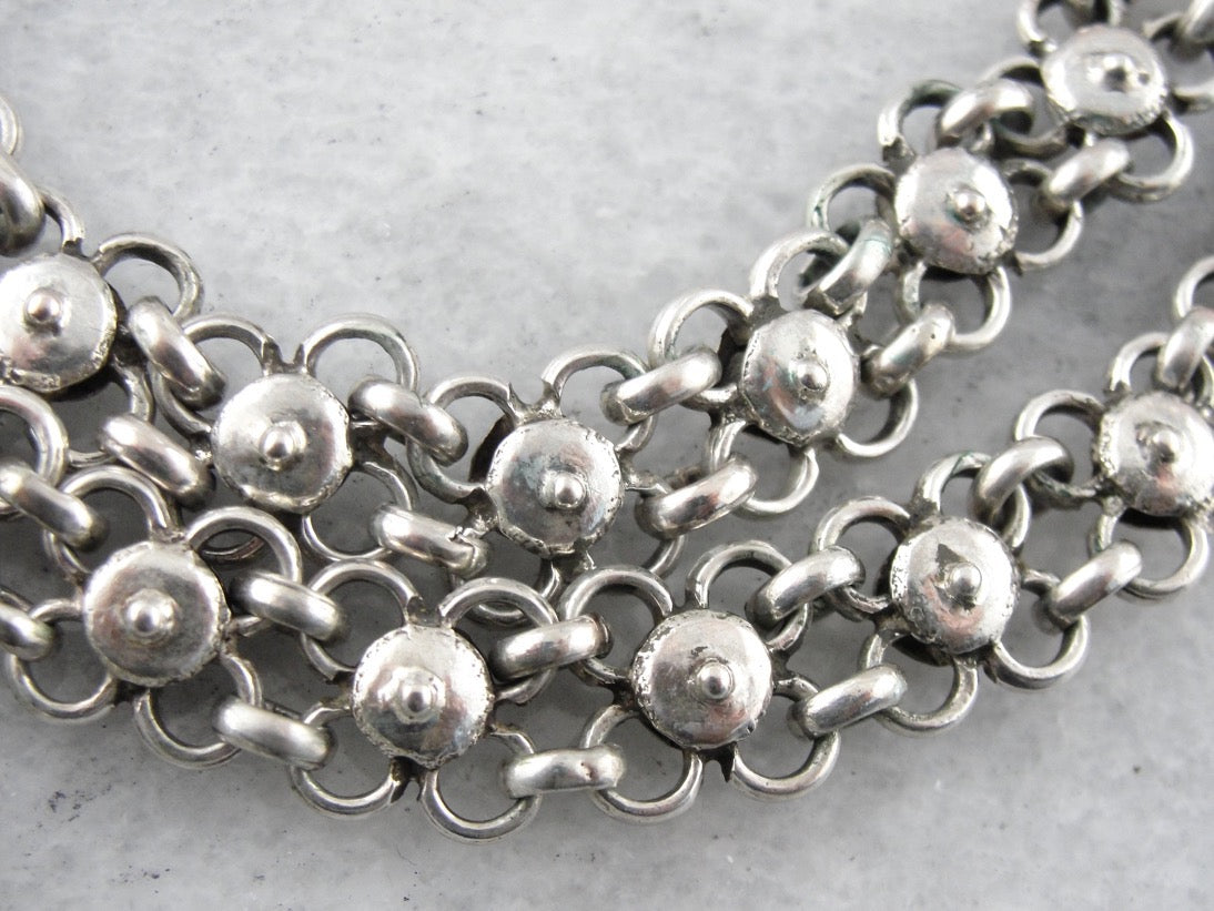 Absolutely incredible! This vintage necklace features faceted domes of silver, individually inlaid into the center of each knotwork link. The use of coin silver makes this heavy-weight necklace far more affordable, creating a statement piece that can be worn day or evening without total comfort.