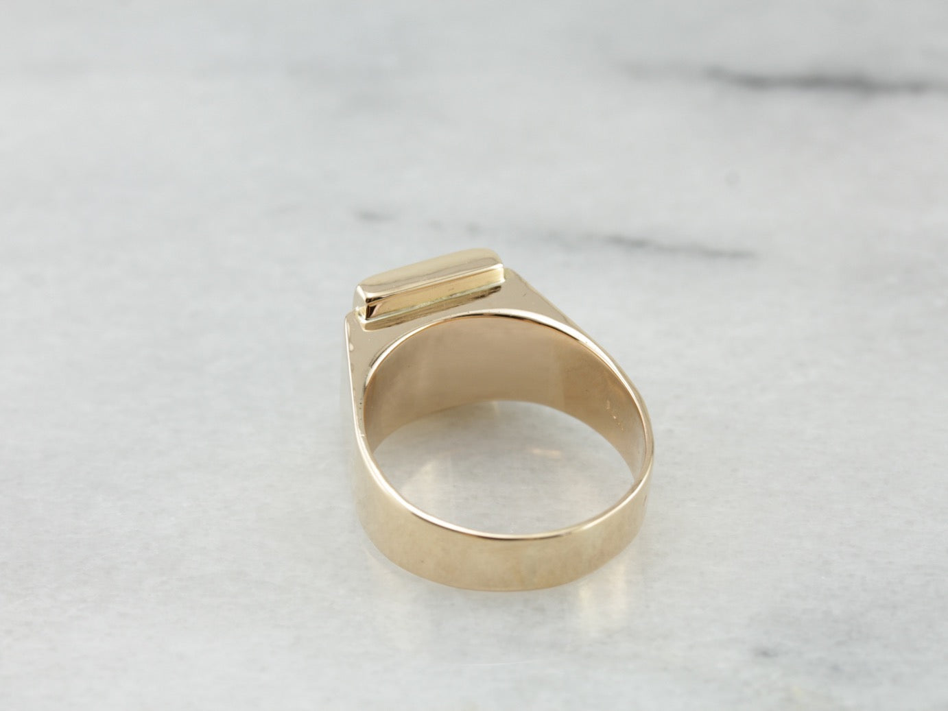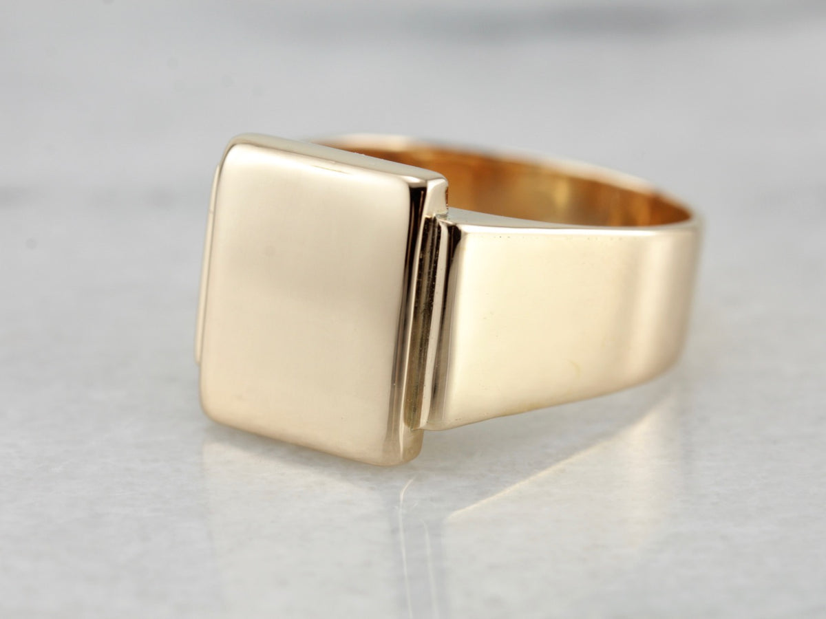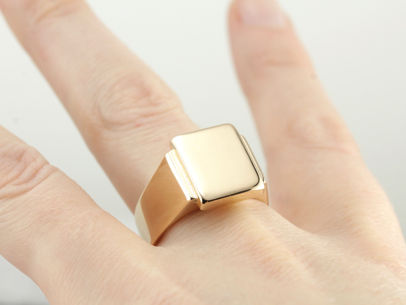 This is a hefty, thick and solid vintage signet ring with an unusual shape! We love the way that the centerpiece looks like a tablet, ready to be carved with your family crest or monogram! Crafted of high karat gold with an immaculate eye to detail, this vintage ring will make a wonderful family heirloom, treasured for generations to come.