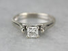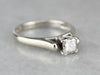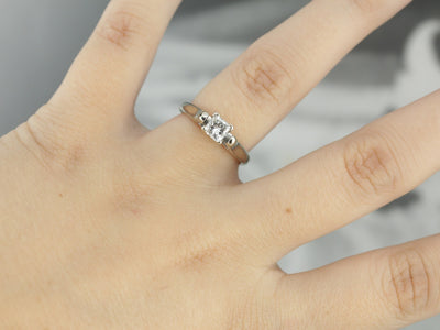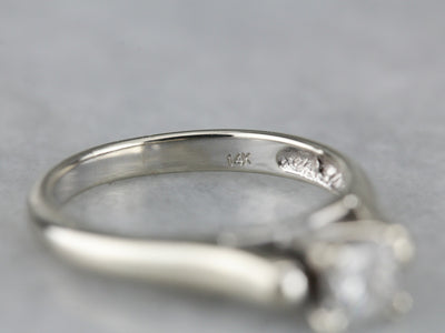 This high quality diamond stands proud and tall in its sleek white gold setting! Elongated shoulders accent either side of the gem and give the illusion that it's floating. This is a unique twist on a timeless design!