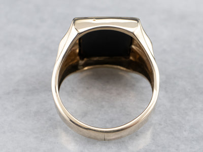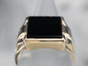 This vintage men's ring is stylish black onyx and yellow gold, a combination that is sophisticated and traditional. The design of this ring offers a little more size and substance but is still easy to wear. It sits flush to the hand and will be a great style piece for any man!