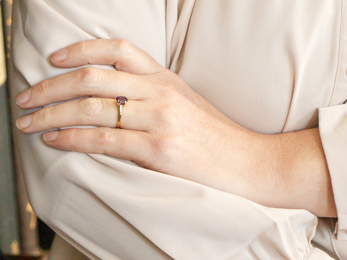 Metal: 14K Yellow and White Gold Gem: Plum Sapphire 1.75 Carats Gem Measurements: 8.0 x 6.6 mm, Oval Accents: 6 Diamonds totaling .08 Carats Ring Size: 5 Marks: "14K" Stamped on the inside band