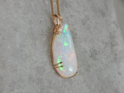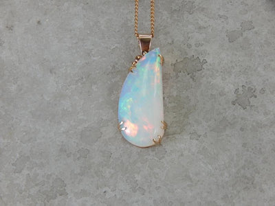 The colors inside this Ethiopian opal pendant are intense: pinks and oranges, glowing greens and fogs of purple and peach. We've set this important and exceptional gemstone in to a fitting frame, a multi -pronged setting with classic style and minimal decoration gracing the rose gold bail.