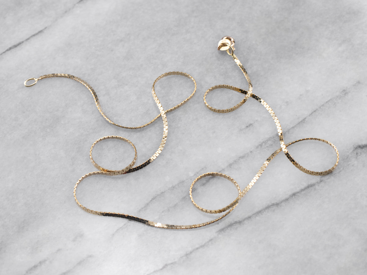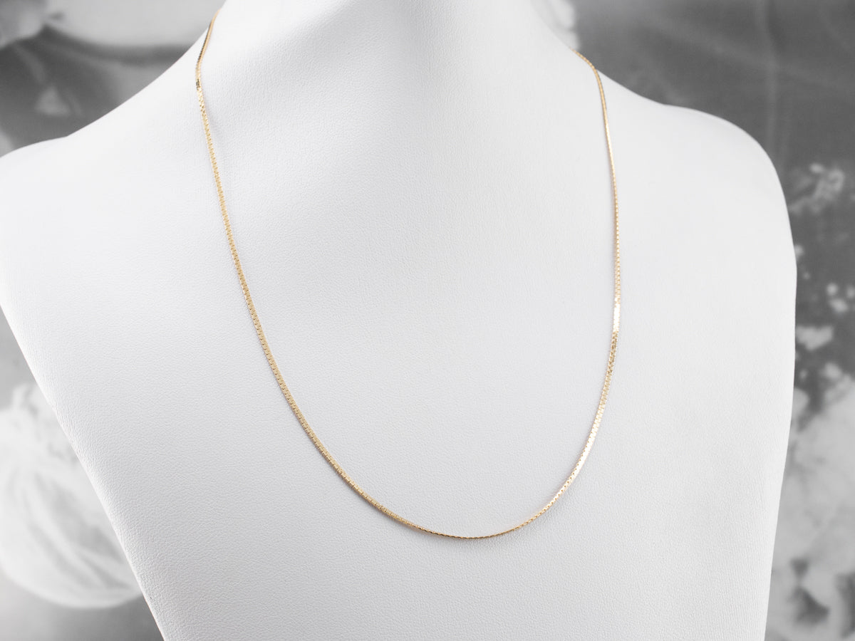 This chain has a flat design that stays in place when worn, while also remaining fluid. Crafted of 14 karat gold, this necklace has a very bright polish that catches the light beautifully!
