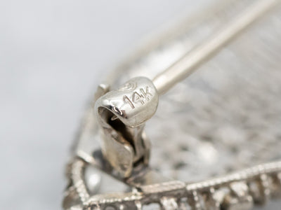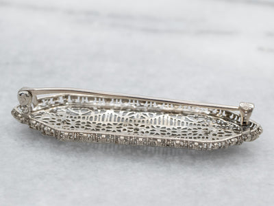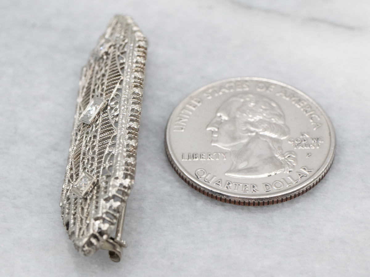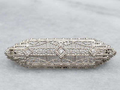 A classic piece of Art Deco finery! This beautiful filigree brooch is crafted from white gold and is full of intricate detail. A diamond accent adds the perfect finishing touch to the center.
