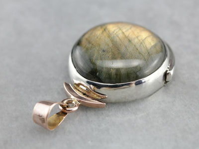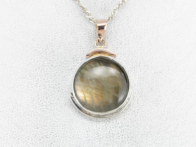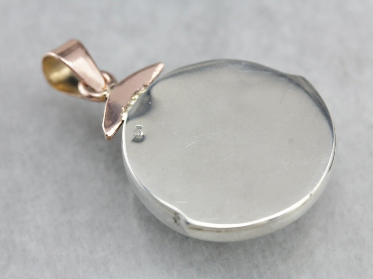This pendant was handcrafted in our studio, using pieces dating to several eras. The silver frame is vintage, and it combines perfectly with the rose gold bail that we've used to create a finished pendant!