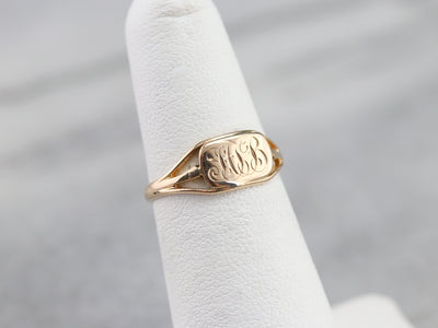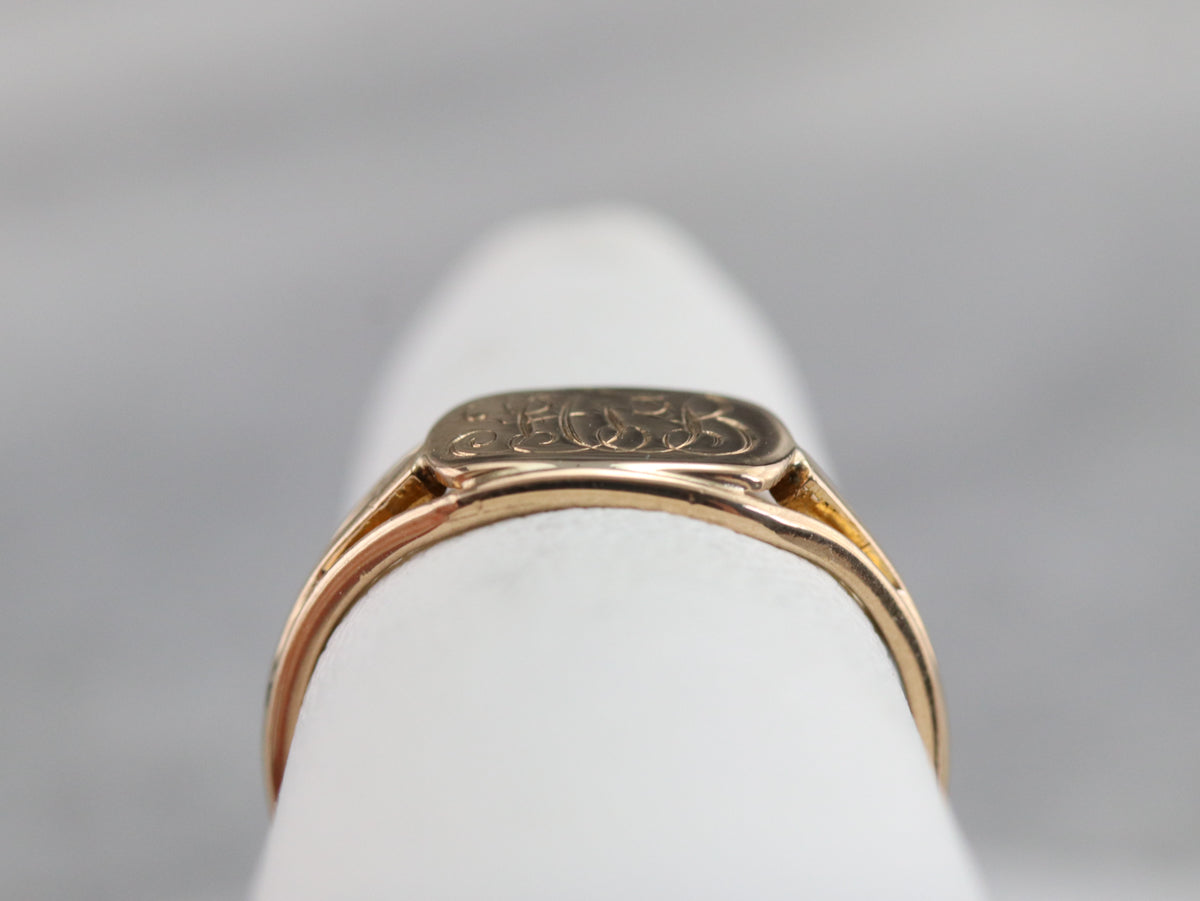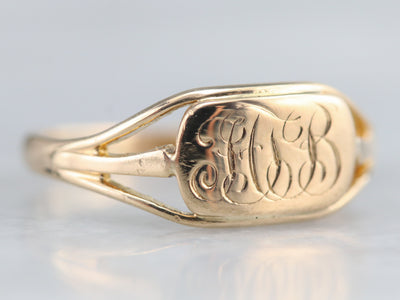 The engraving of this gold signet ring bears the monogram "FTB" wrought in scrolling French script that's a lovely match to the pretty curves of the mounting. This sophisticated, vintage signet ring is sure to be a treasured memento.