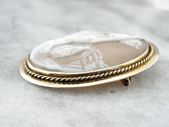 This pretty antique piece dates to the Victorian Era. It depicts a woman walking up a hill overlooking an old European city. The castle and tower are particularly well executed. Called Landscape cameos, these are portraits of the place they were created, an image of an old city caught in artistic shell.