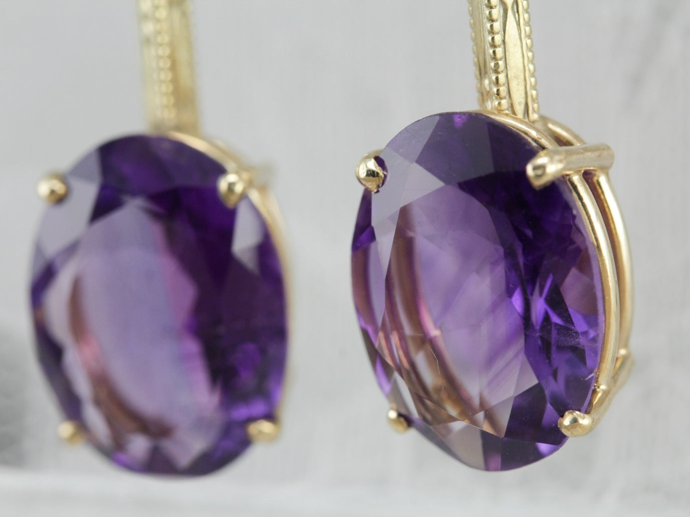 Gorgeous, here we've set deep, rich, purple amethyst in simple baskets of 14k yellow gold. The open back allows light through the entire stone, accentuating the superb cutting of these bright stones! The bar in the center has stunning details in green gold, originally links from an Art Deco pocket watch chain. At the very top are the earring wires, hinged lever backs set with brand new diamonds, 14k yellow gold with a simple polished design. These are comfortable to wear and very secure!