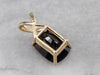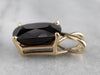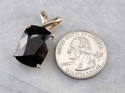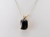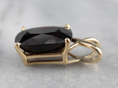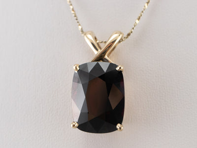 This is a simple and timeless piece. A large cushion cut, dark red garnet is the focus, accented with rich gold prongs that contrast beautifully. Perfect for everyday wear, this would make a lovely anniversary piece!