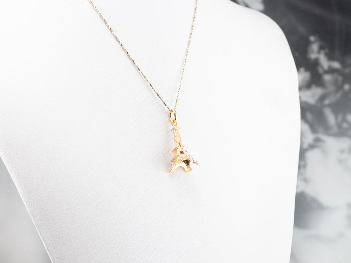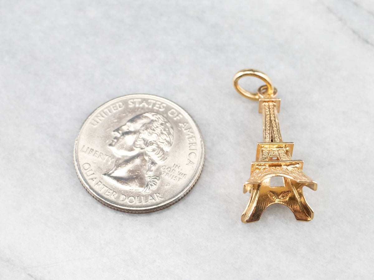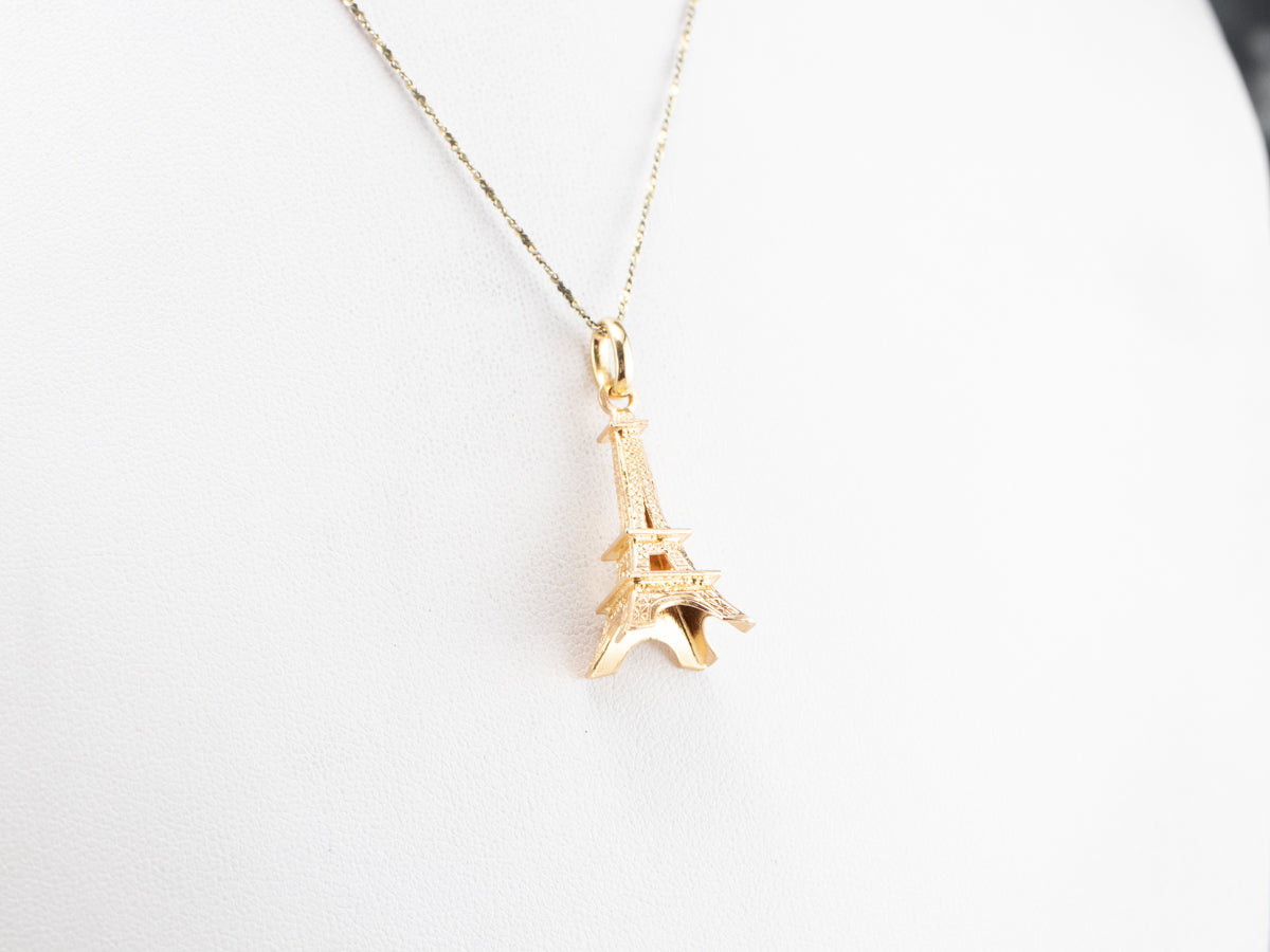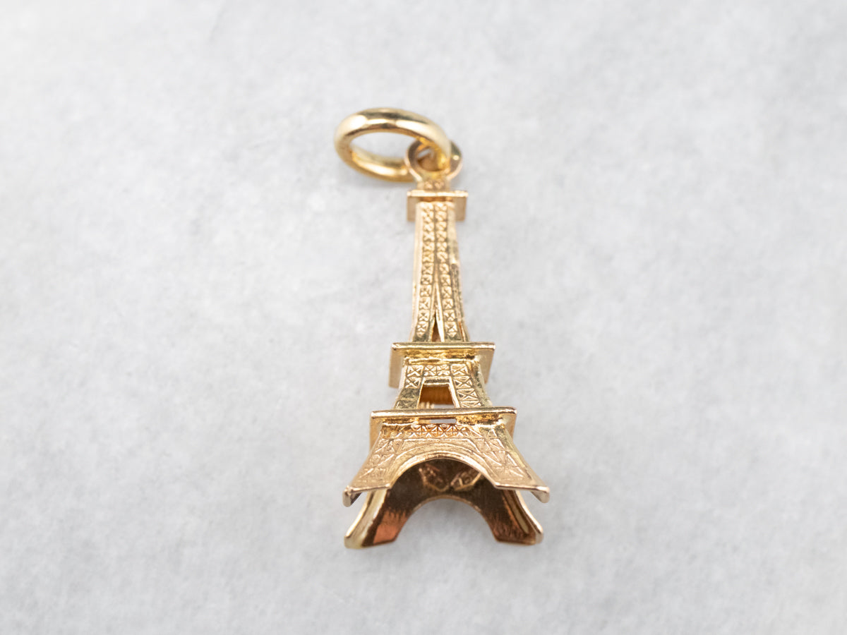 This large Eiffel Tower pendant is detailed and sweet, crafted of 18 karat yellow gold. It would make a great piece to wear as a signature piece, a token of an unforgettable trip, or the motivation for your dream destination. The condition is excellent, and the detailed texture is crisp and clear.