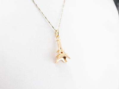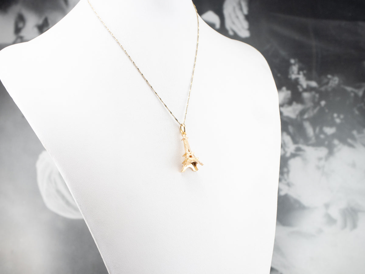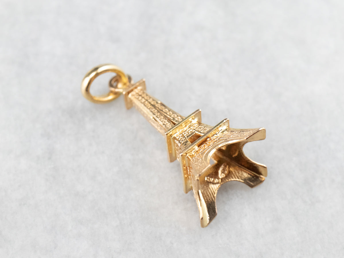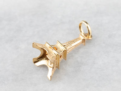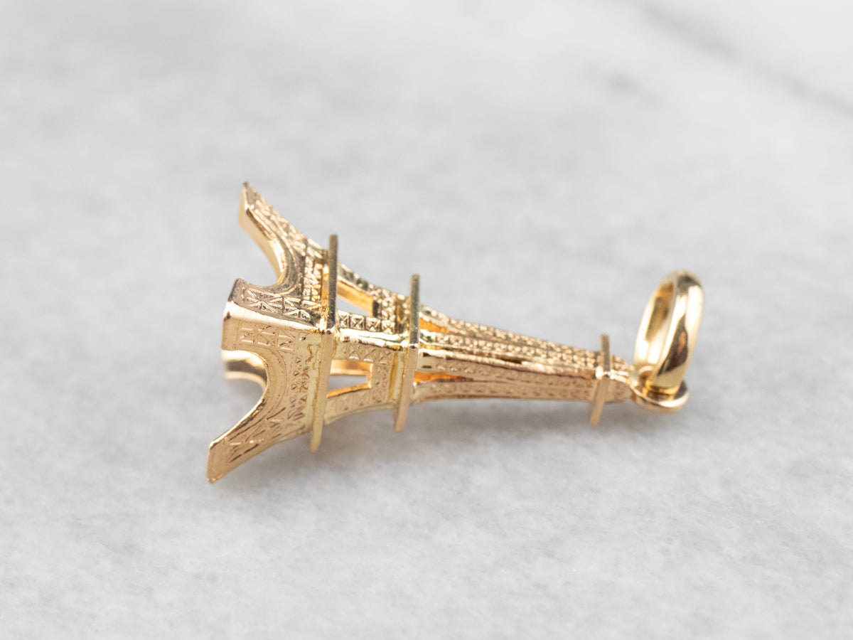 This large Eiffel Tower pendant is detailed and sweet, crafted of 18 karat yellow gold. It would make a great piece to wear as a signature piece, a token of an unforgettable trip, or the motivation for your dream destination. The condition is excellent, and the detailed texture is crisp and clear.