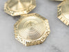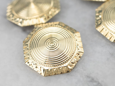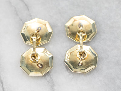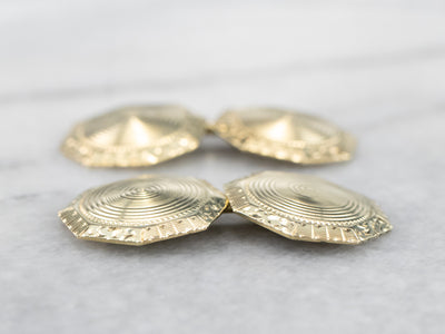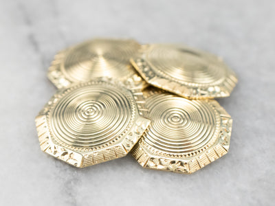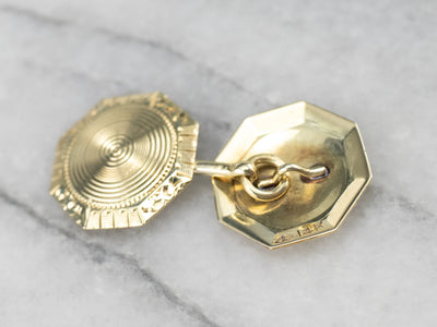 These gorgeous 1930's cufflinks are sophisticated, with a tasteful profile and elegant proportions! Crafted of 14 karat green gold and etched with traditional geometric motifs, these gorgeous pieces have a luxurious feel, suitable for a wedding day tuxedo or black-tie event.