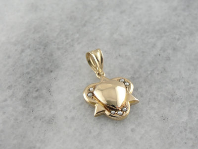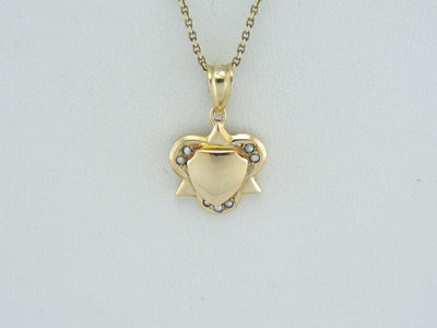 The shape of this piece is unique, with layers of three sided shapes giving the appearance of a knot when viewed in profile. Sweet seed pearls grace the curves of the pendant, while a shield at the center is ready to be engraved with your initials.