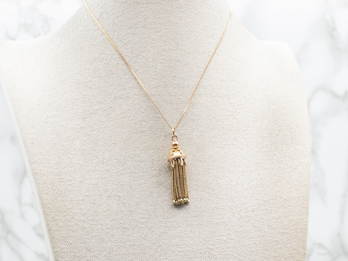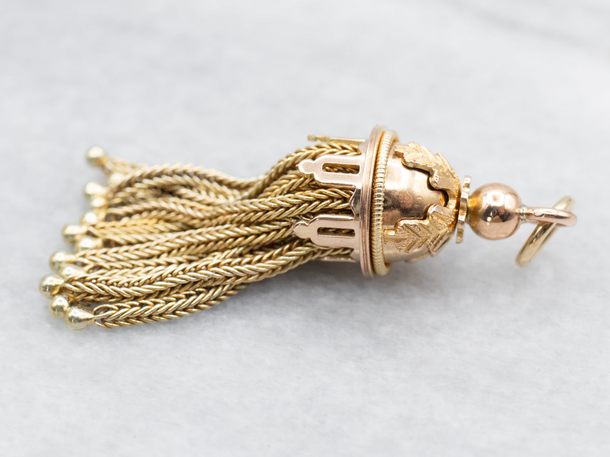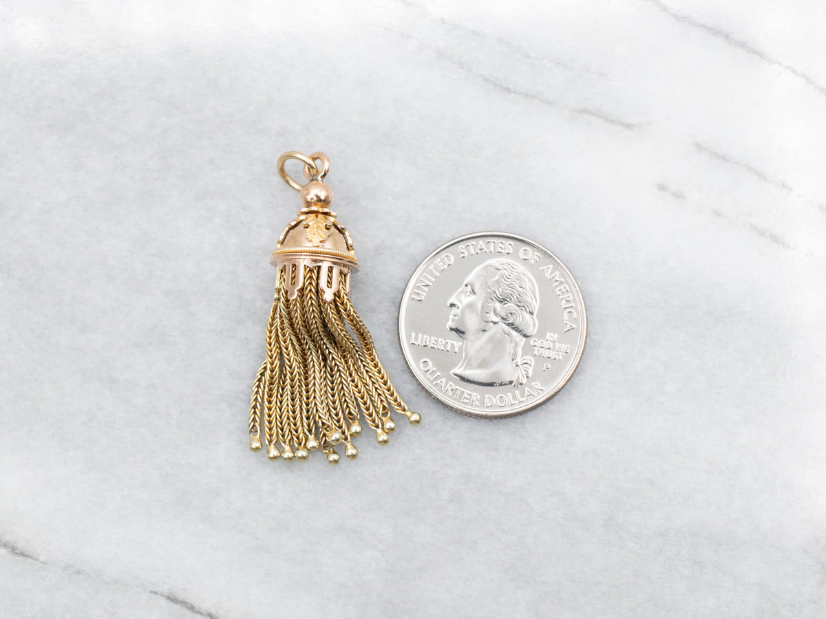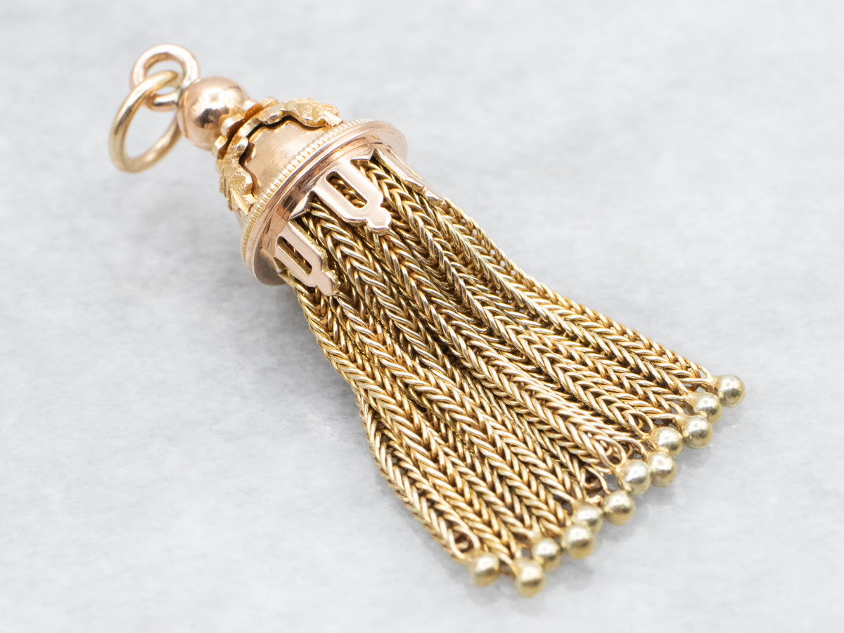 This outstanding example of Victorian workmanship features gorgeous botanical details on the cap, the better to catch the light in this lovely draping pendant! The tassels are woven wires, while the cap that holds them in formation features an ornate three-dimensional design. All classic Victorian motifs, this simple piece is in excellent condition and ready to wear!