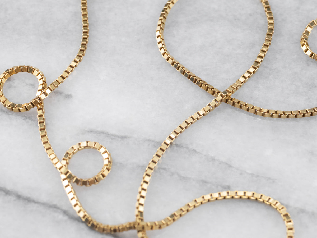 This 23-inch box chain has a delicate presence around the neck! The thin profile makes this necklace perfect for stringing with a pendant, while the 18 karat gold is classic and versatile.