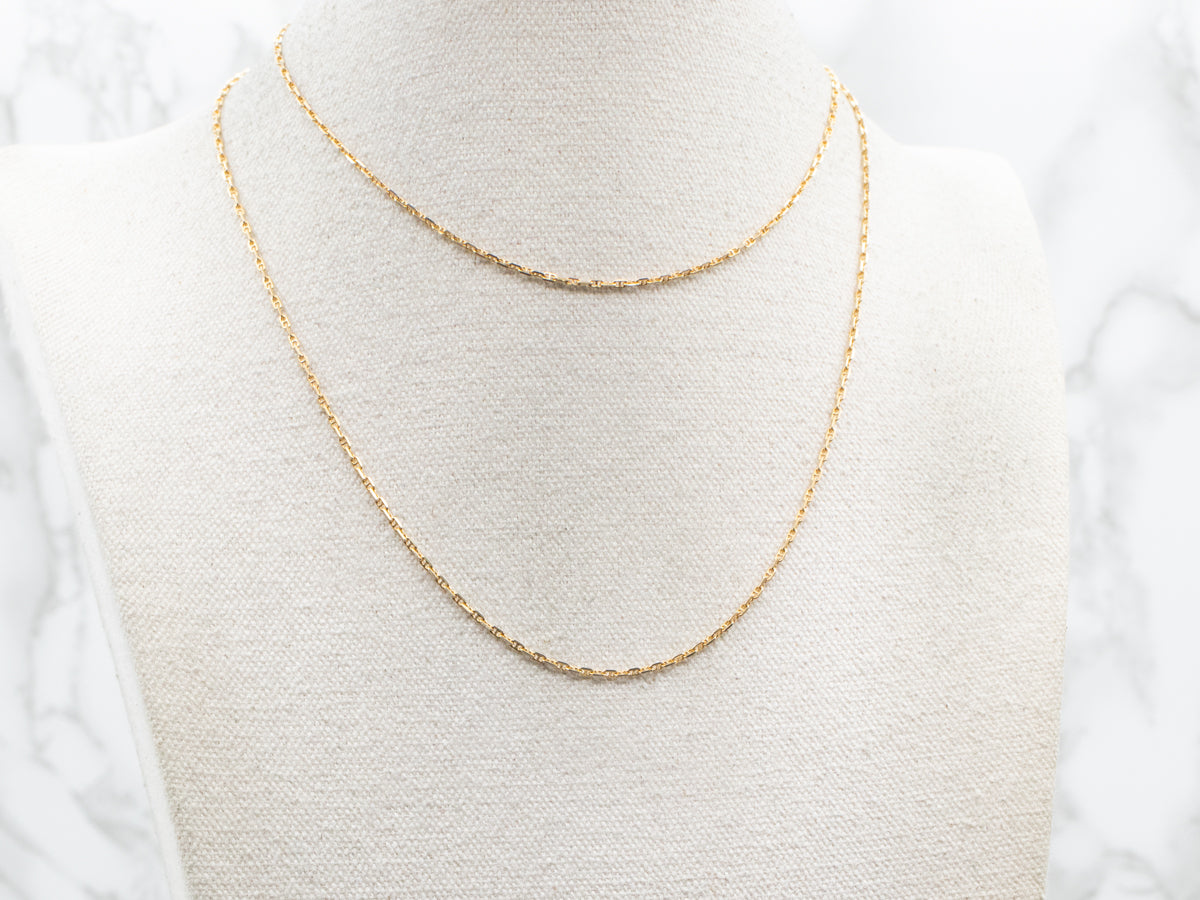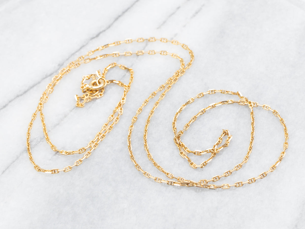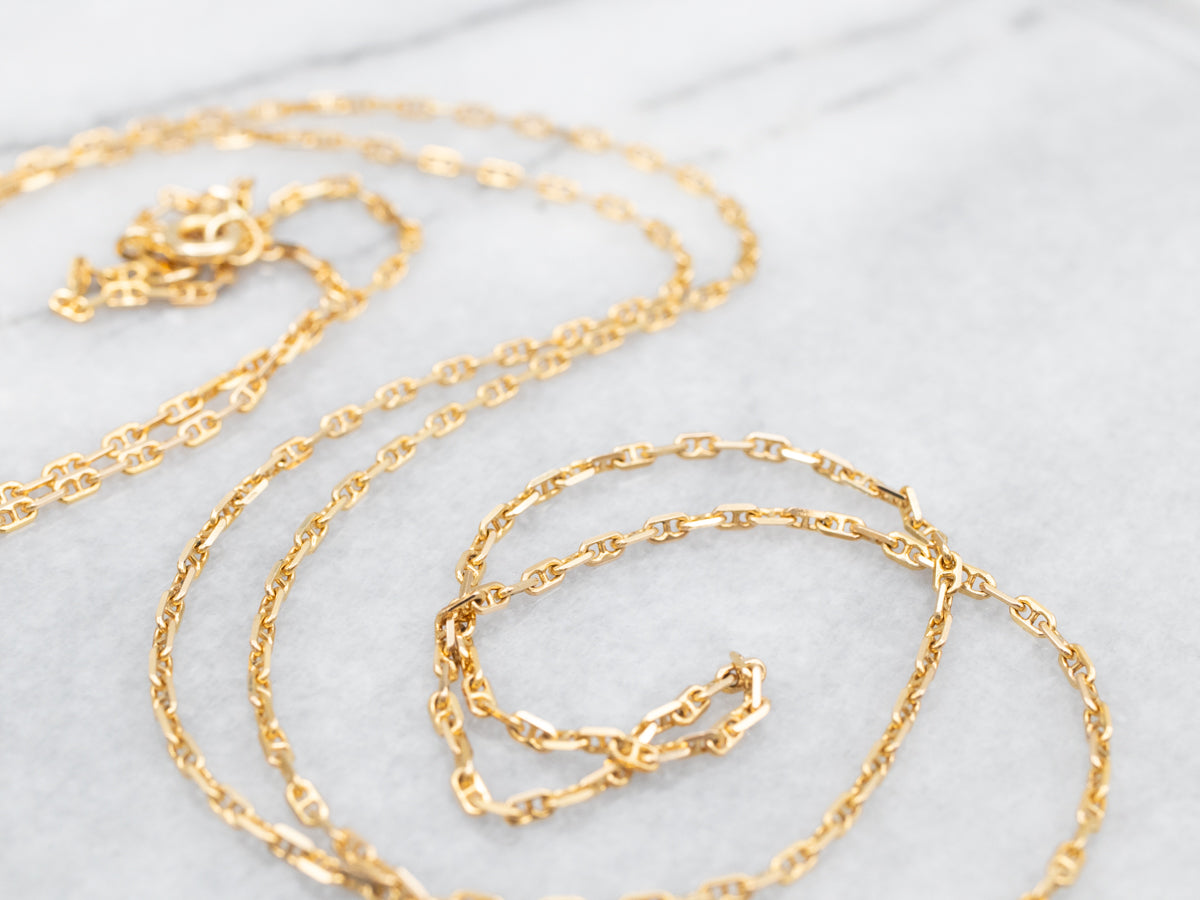 The chain exudes sophistication. Made of yellow gold, this long chain features a timeless mariner link design and is secured with a spring ring clasp. Elevate any outfit with this elegant piece!