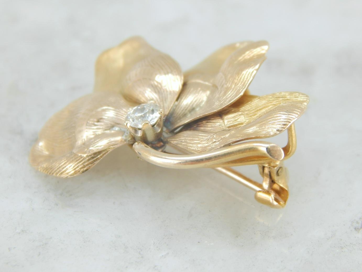 Absolutely outstanding! This vintage shamrock brooch is crafted of 10 karat gold, perfectly polished and finished with a diamond at the center.