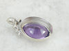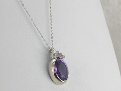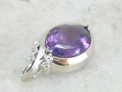 A slightly more casual edition of our newest gemstone pendant line, this piece uses a bezel set, polished white gold watch frame from the 1950's. The frame makes a perfect pendant shape, with small diamonds accenting the bail! We've set this with an amethyst of lovely color, a deep purple stone with tons of flash!