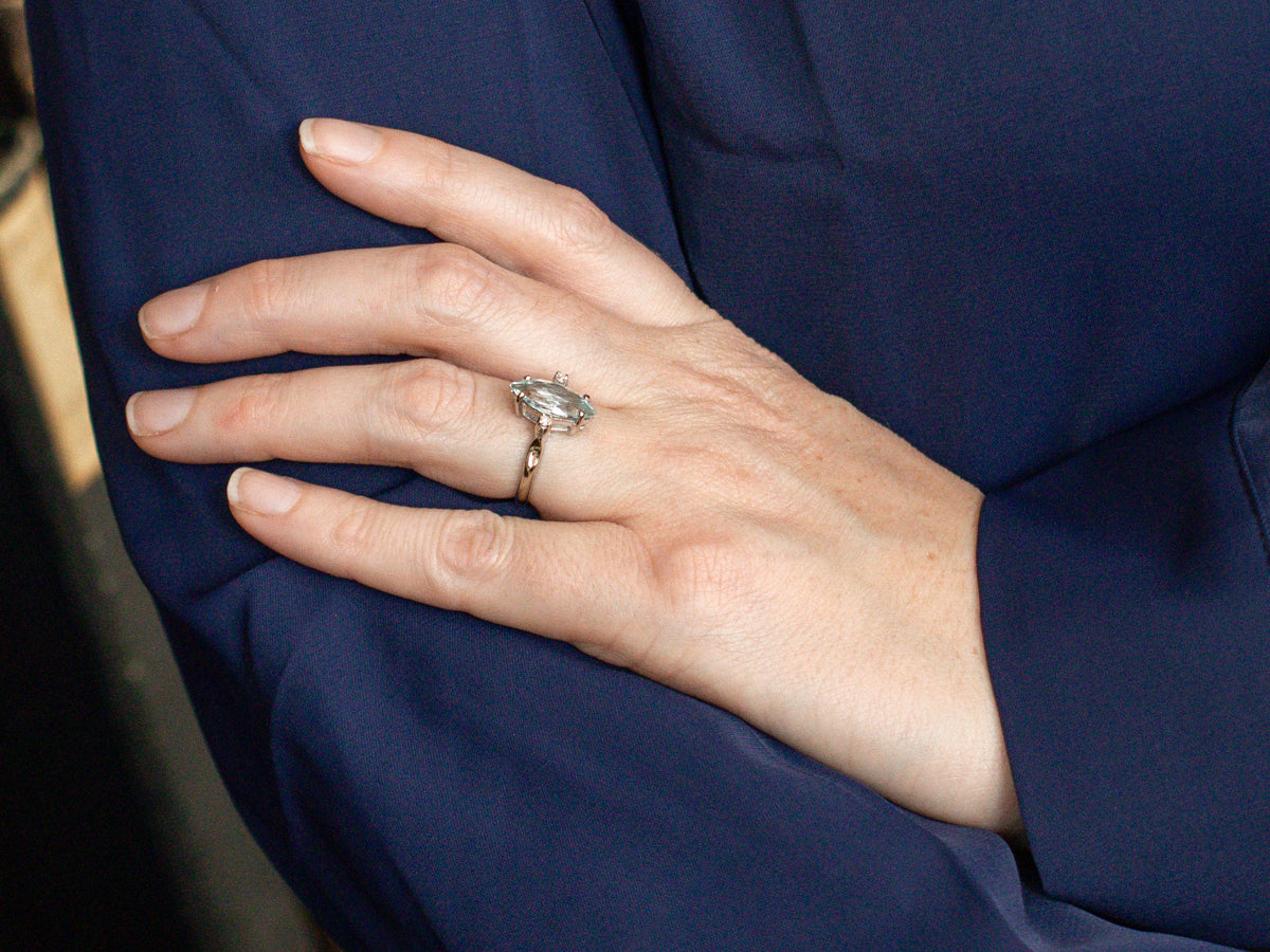 This stunning ring features a sparkling marquise cut aquamarine, flanked by brilliant diamonds. The cool white gold band pairs beautifully with the pale blue aquamarine, giving an icy feel to this statement ring. The unique cut of the stone is only further enhanced by the diamond accents.