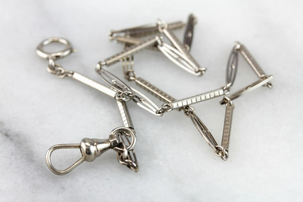 This 1920's era watch chain features textured bars and small, well balanced marquise shaped links. Thinner and finer than some of our other watch chains, this would make a lovely component for a custom necklace as well.