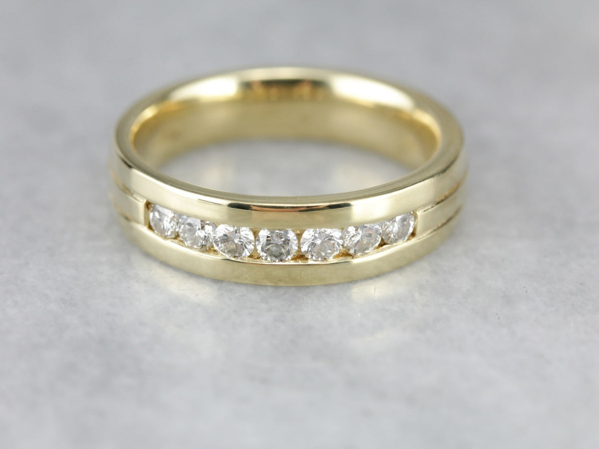 You cannot go wrong with the simplistic beauty of this channel set wedding band! Crafted from 18 karat green gold and set with seven quality diamonds, the band is also a comfort fit, which means that the interior of the band has smooth edges, making the band feel silky and comfortable on the finger!