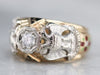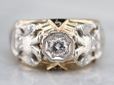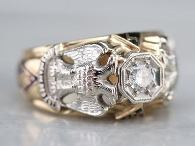 This vintage men’s diamond ring is crafted from palladium and yellow gold in a traditional Masonic motif. The shoulders feature crisp colorful enamel Masonic symbols, atop of the band adorns the stately twin-headed eagles! Particularly nice here is the way that the eagles rest on the finger, comfortable and light, making this vintage ring a wonderful piece for day to day wear.