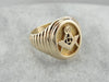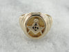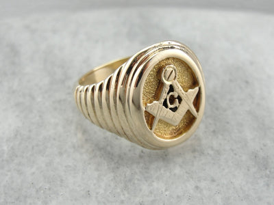 Classic and yet unusual! This men s ring crafted from warm, yellow gold is a timeless signet shape, garnished on top with a gold Masonic symbol! Modestly sized in profile but well balanced on the finger, this would be a great piece for everyday wear.