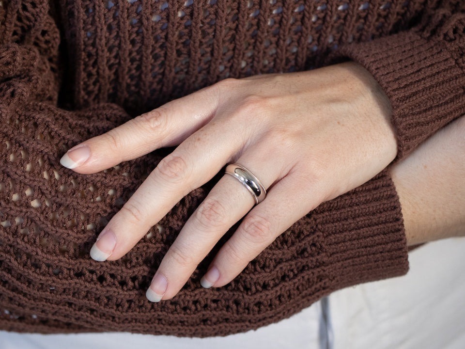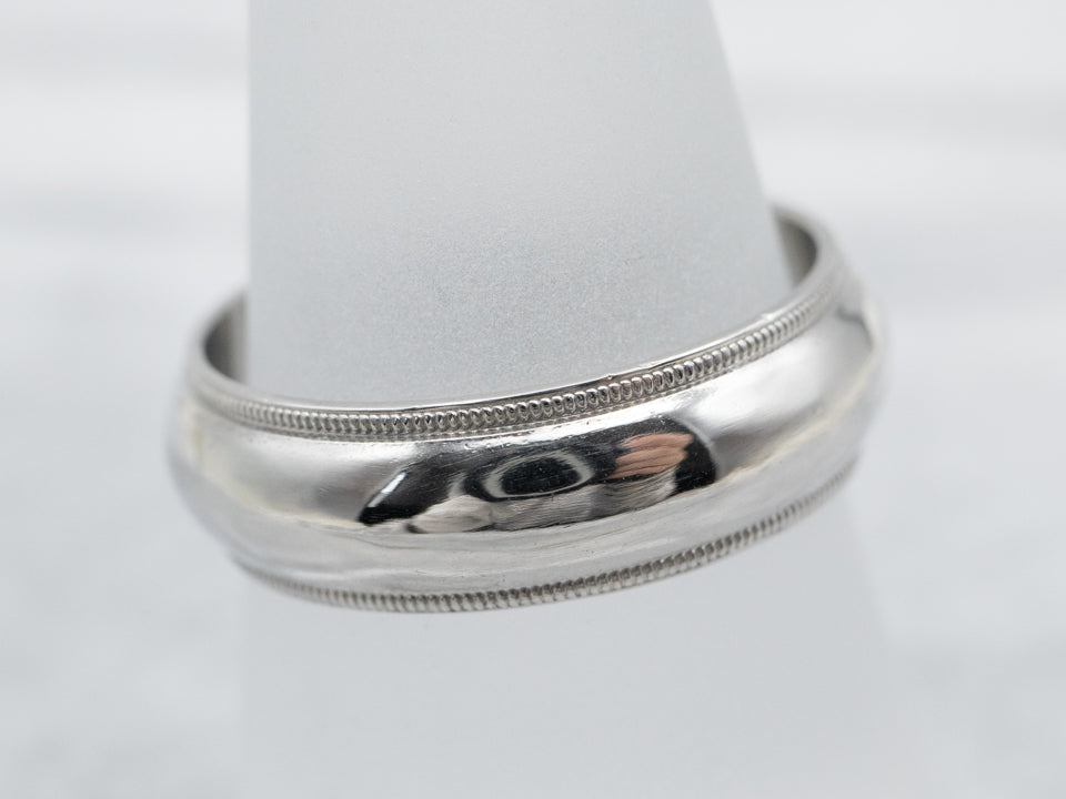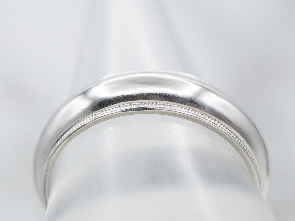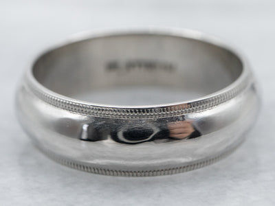 Simple and subtle, this comfort fit band features a low dome on top and a beautiful, soft polish. The profile and finish are simple, with just a milgrain decoration, giving this piece a nice profile for a man or a woman. This band has a perfect polish and is ready to wear.