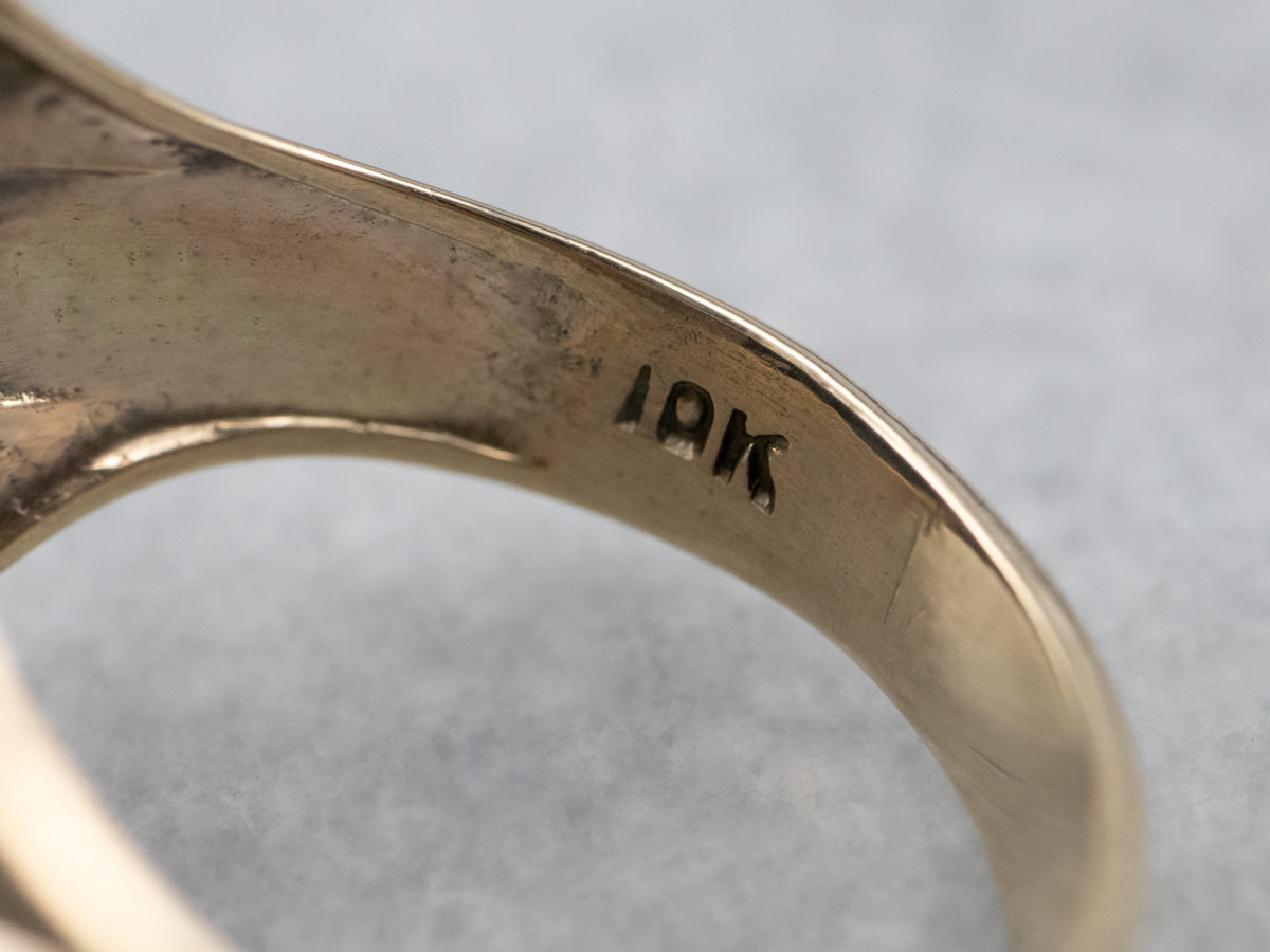 Clean lines and classic shape make this ring timeless, and the bold size means it will be perfectly in proportion on even the largest hand. Crafted from yellow gold, the ring has a wonderful low profile, simple metal details, and a beautiful black onyx center. This ring is perfectly proportioned, giving it a sophisticated profile on the finger.