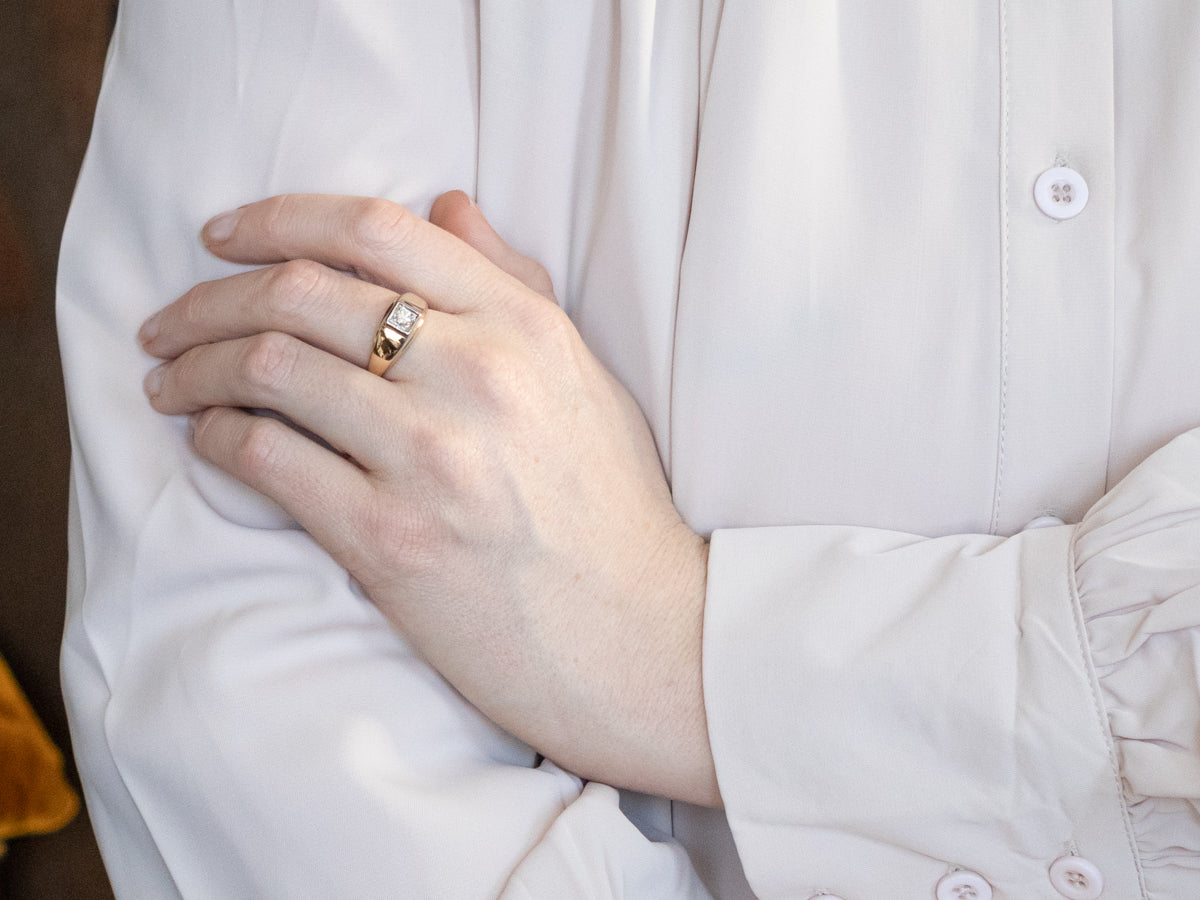 This stately vintage diamond ring would make a great men's birthstone piece! The diamond is set into a square frame of 14-karat white gold that makes it look bigger, drawing light into the center!